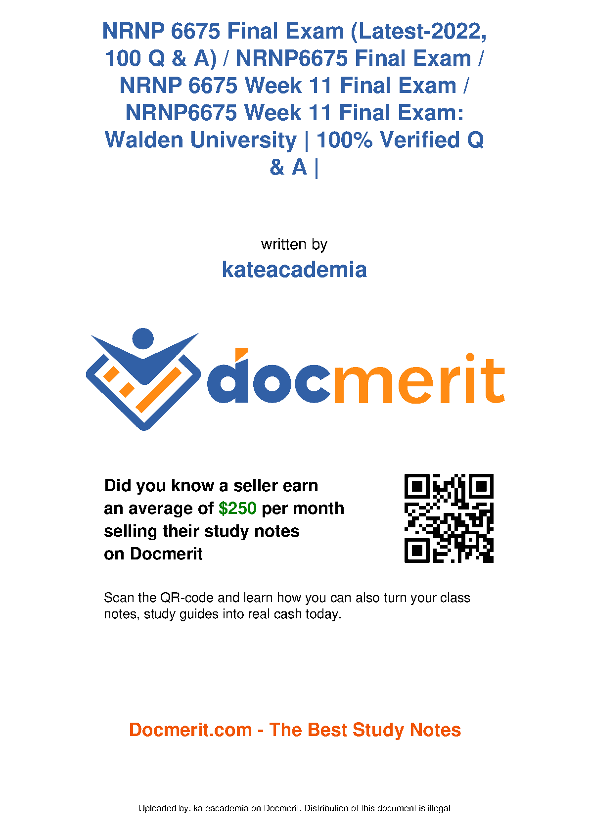 NRNP 6675 Final Exam (Latest-2022, 100 Q & A) / NRNP6675 Final Exam / NRNP 6675 Week 11 Final Exam / NRNP6675 Week 11 Final Exam: Walden University | 100% Verified Q & A | by Kateacademia