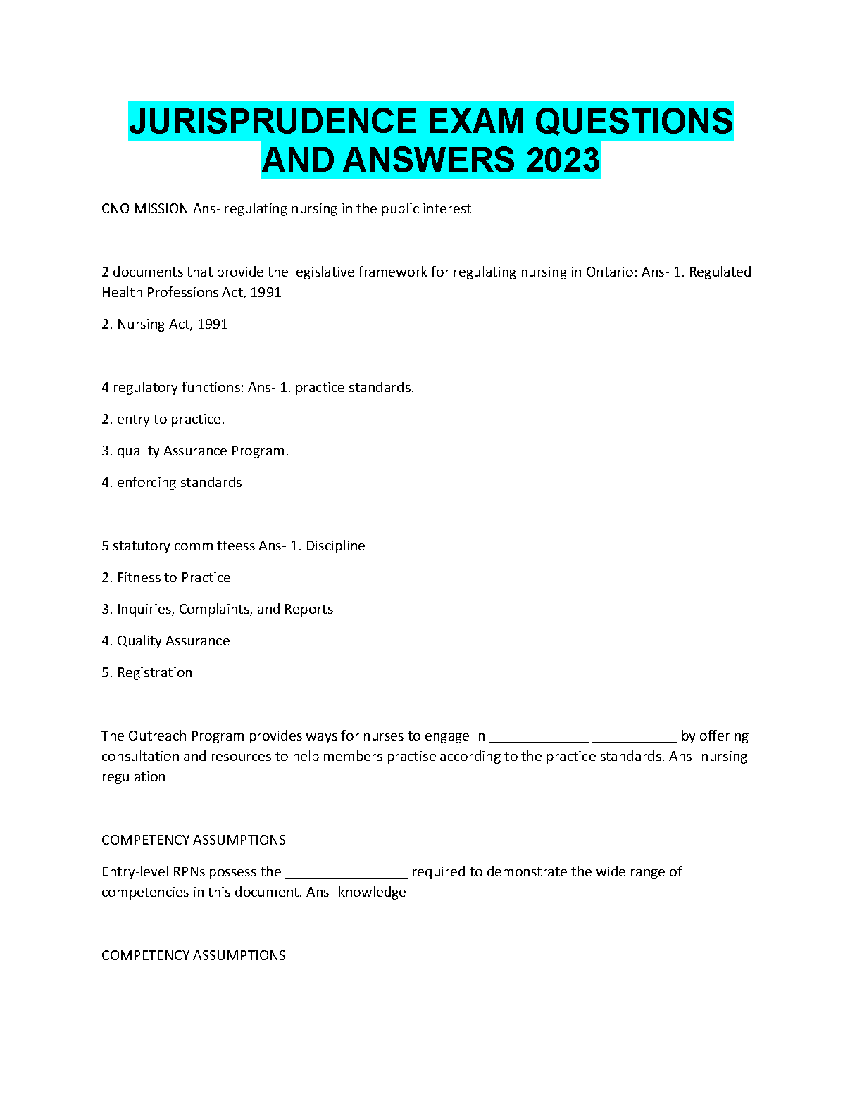 This study guide contains questions and answers covering the 2023 edition of Jurisprudence exam for nursing students, making it a valuable resource for successful exam preparation.