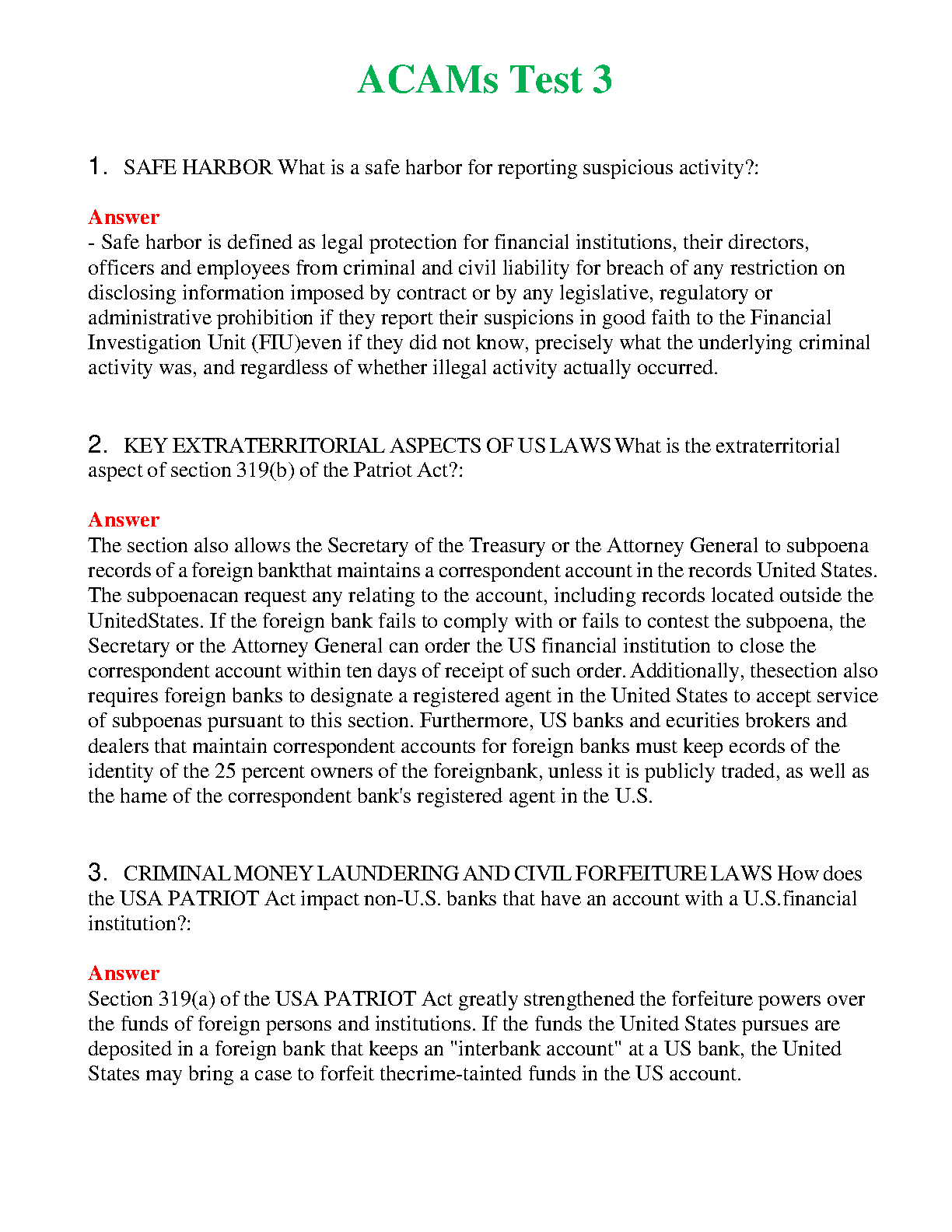 Ace your ACAMS Test 3 with this comprehensive guide! Learn about safe harbor, extraterritorial aspects of US laws, and criminal money laundering and civil forfeiture laws. This resource will provide you with the knowledge you need to pass your exam with confidence and avoid resits.