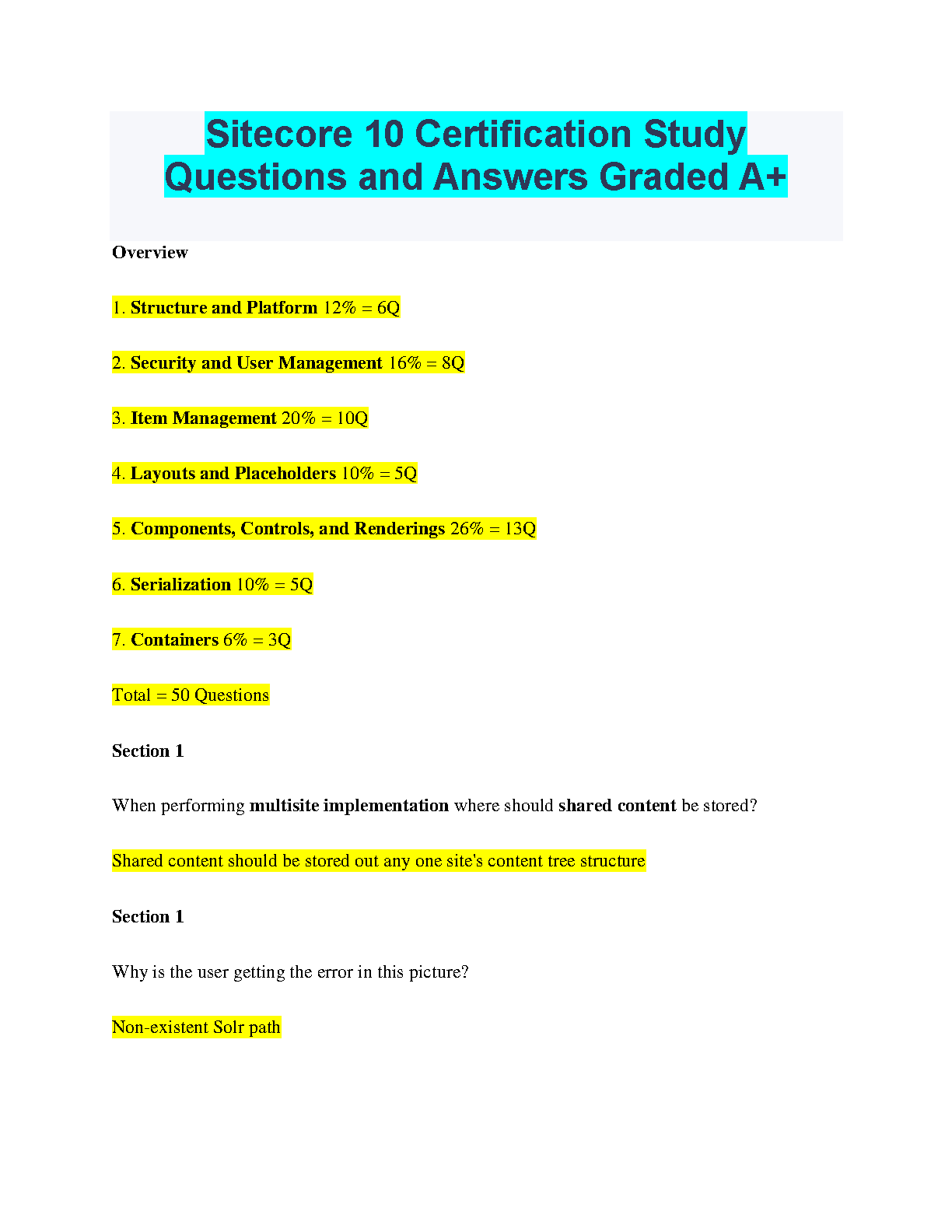 Sitecore 10 Certification Study Guide: Questions and Answers Graded A+ for 2024/2025 Exams