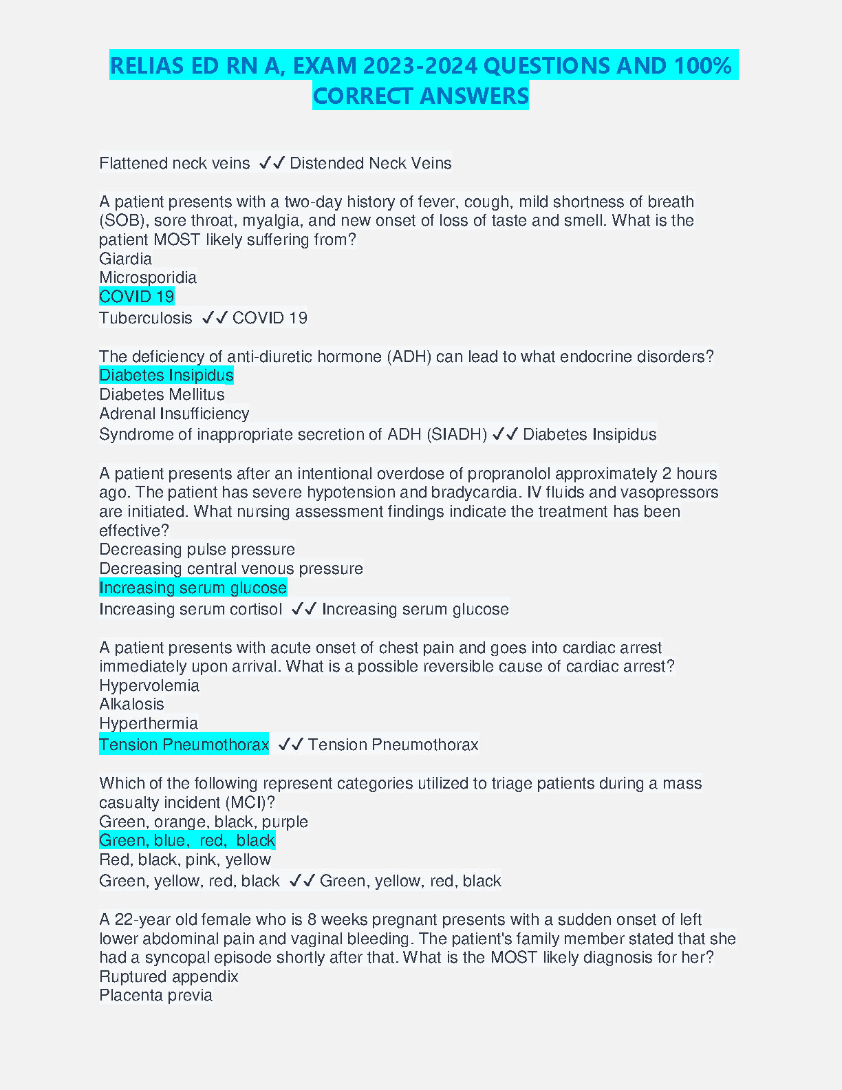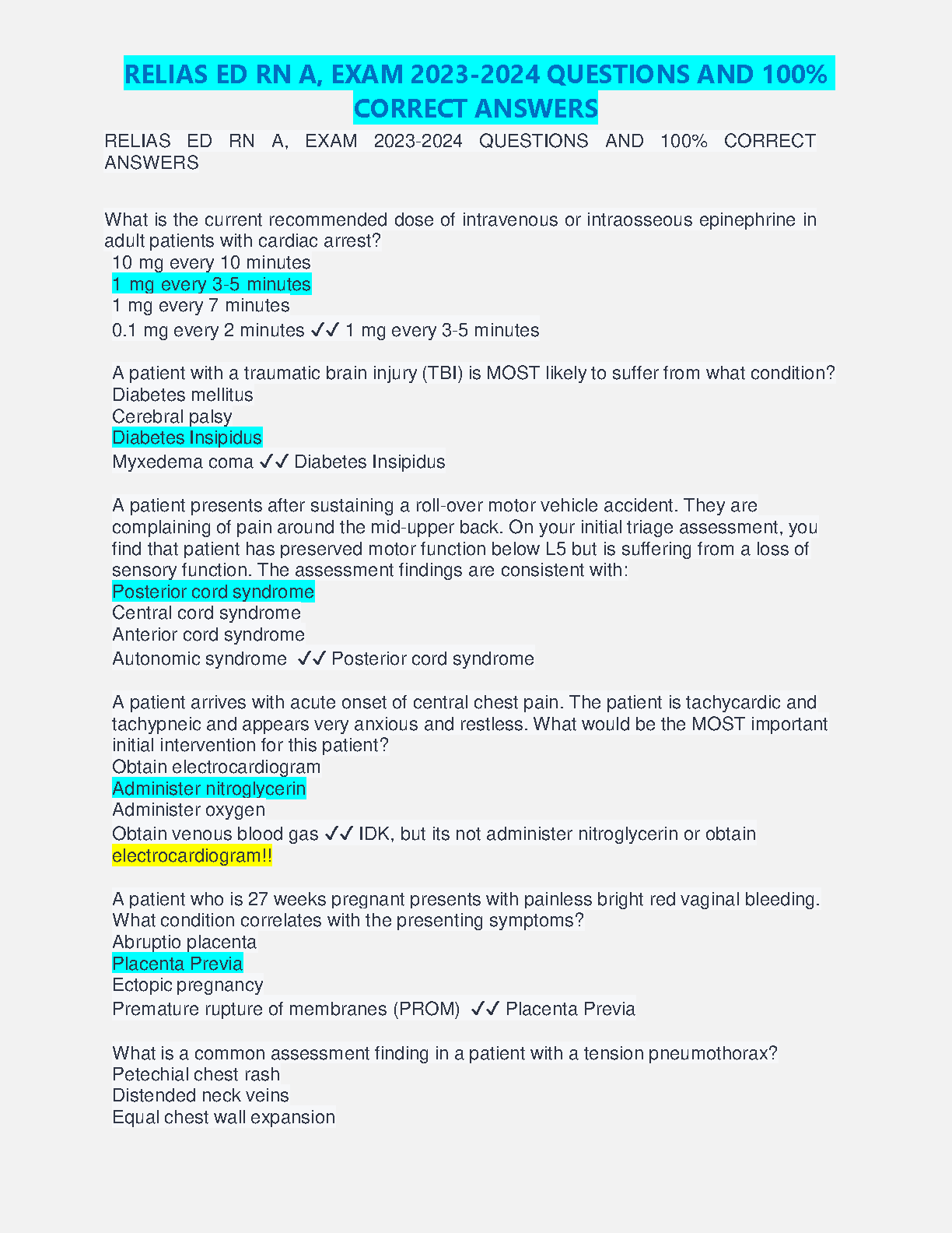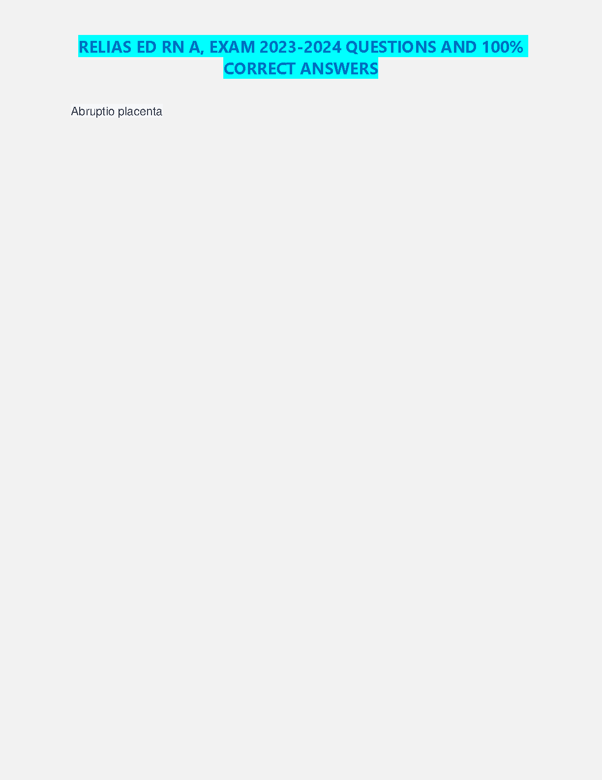 This comprehensive study guide, covers Relias ED RN A. Exam 2023-2024 questions and provides 100% accurate answers. Perfect for students seeking to ace the exam on their first attempt and avoid retakes.