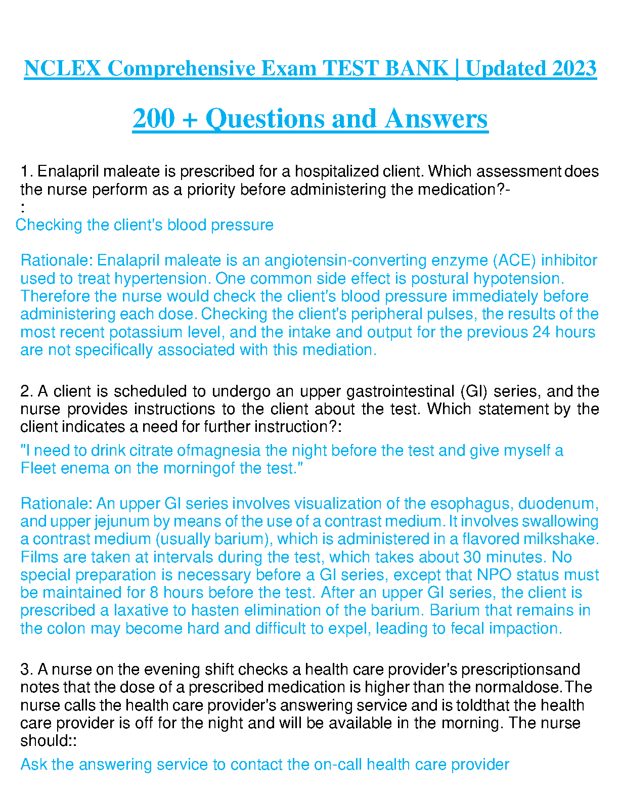 NCLEX Comprehensive Exam Test Bank (Updated 2023) - 200+ Questions and Answers by Unknown Authors