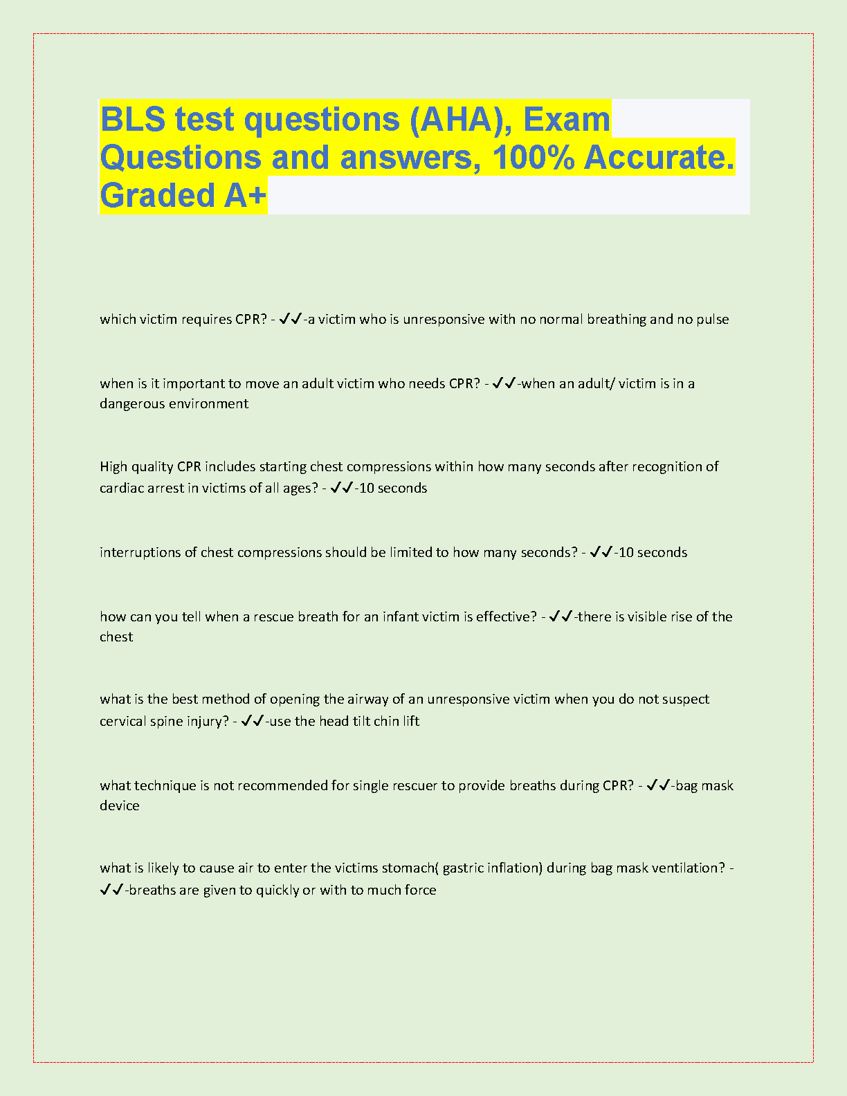 BLS Test Questions (AHA), Exam Questions and answers, 100% Accurate. Graded A+