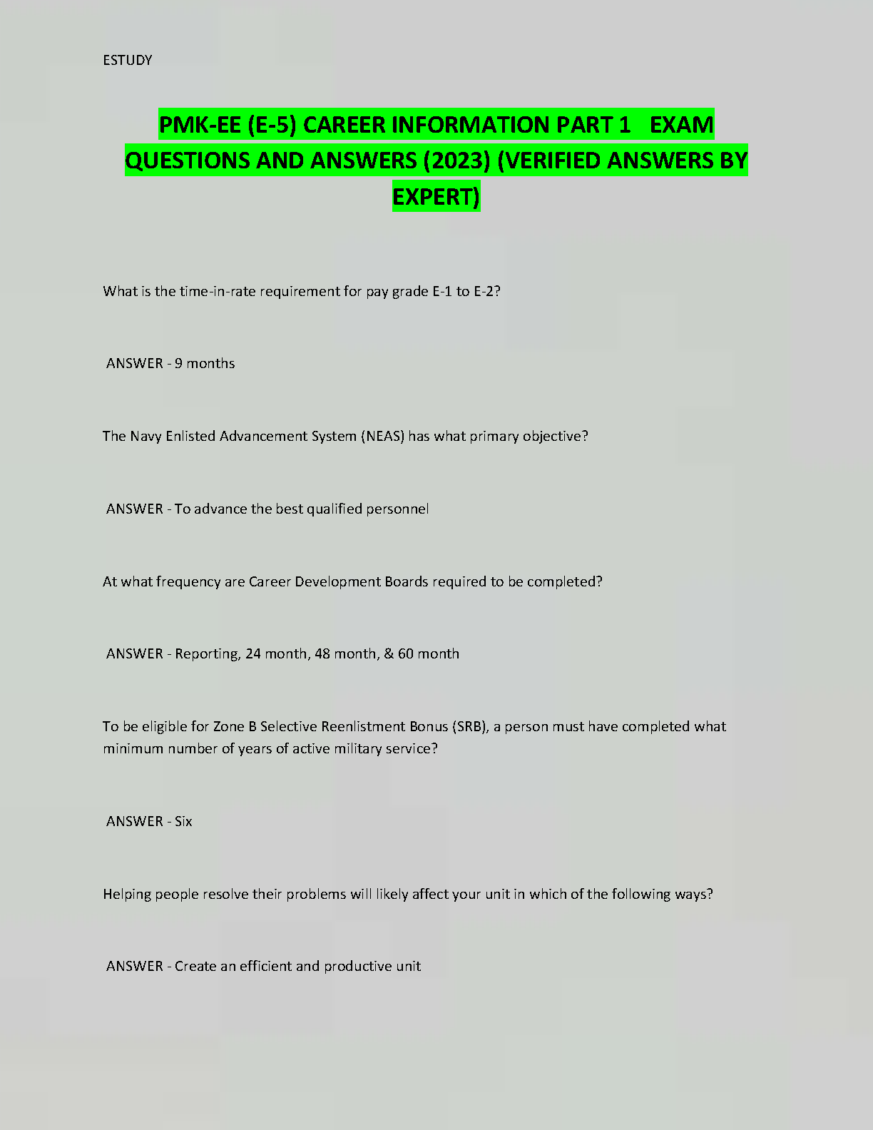 PMK-EE (E-5) CAREER INFORMATION PART 1 EXAM QUESTIONS AND ANSWERS (2023) (VERIFIED ANSWERS BY EXPERT)