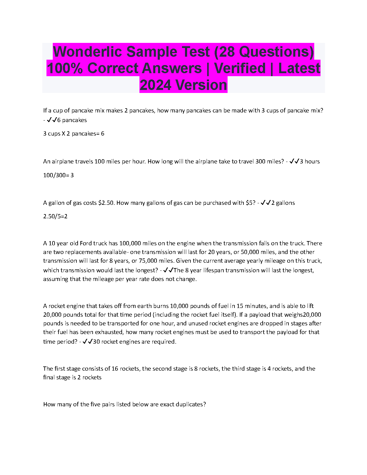 Wonderlic Sample Test (28 Questions) 100% Correct Answers | Verified | Latest 2024 Version - by John A. Wonderlic III