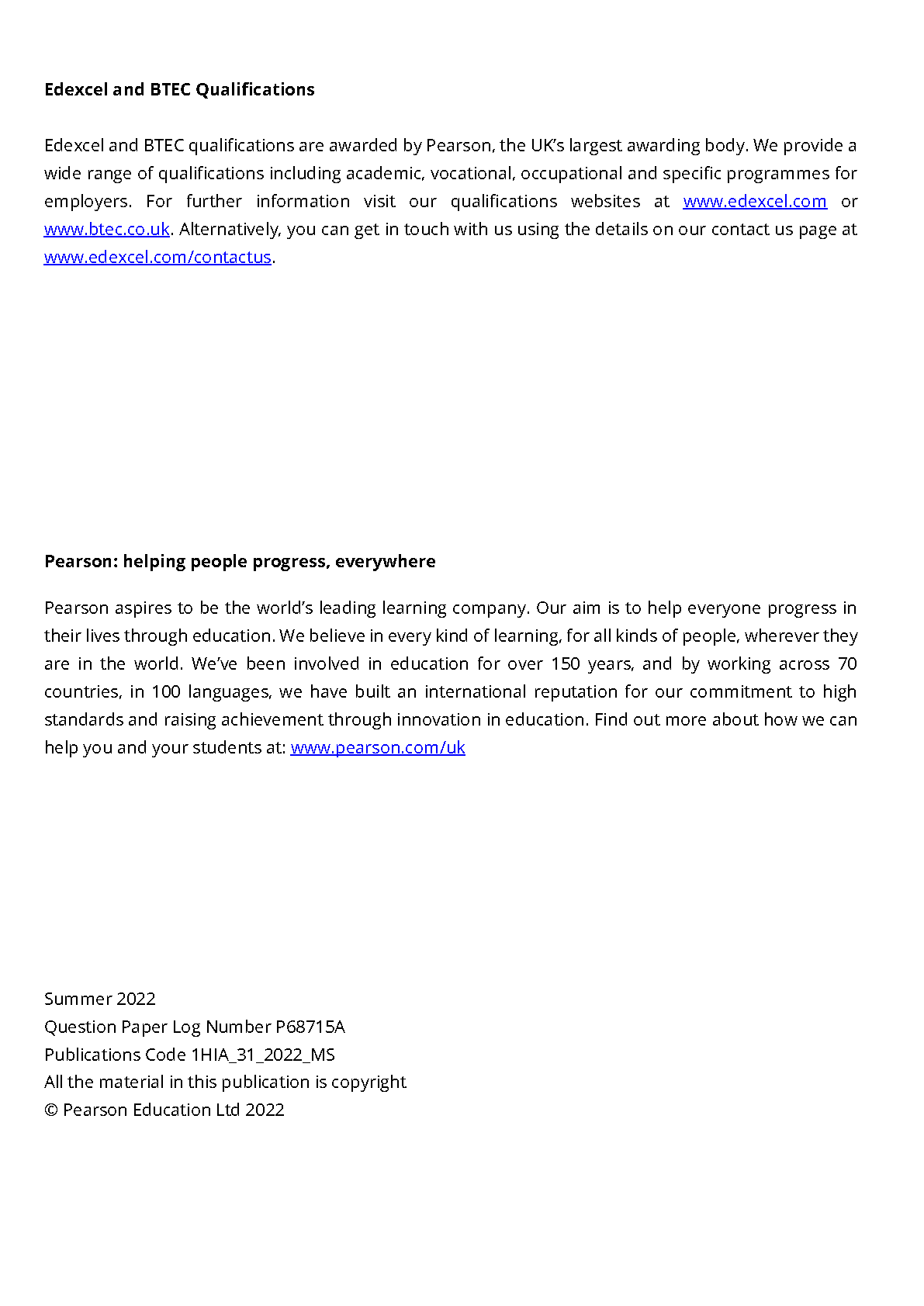 Edexcel GCSE In History (1HIA) Summer 2022 Mark Scheme - Weimar and Nazi Germany (Option 31)