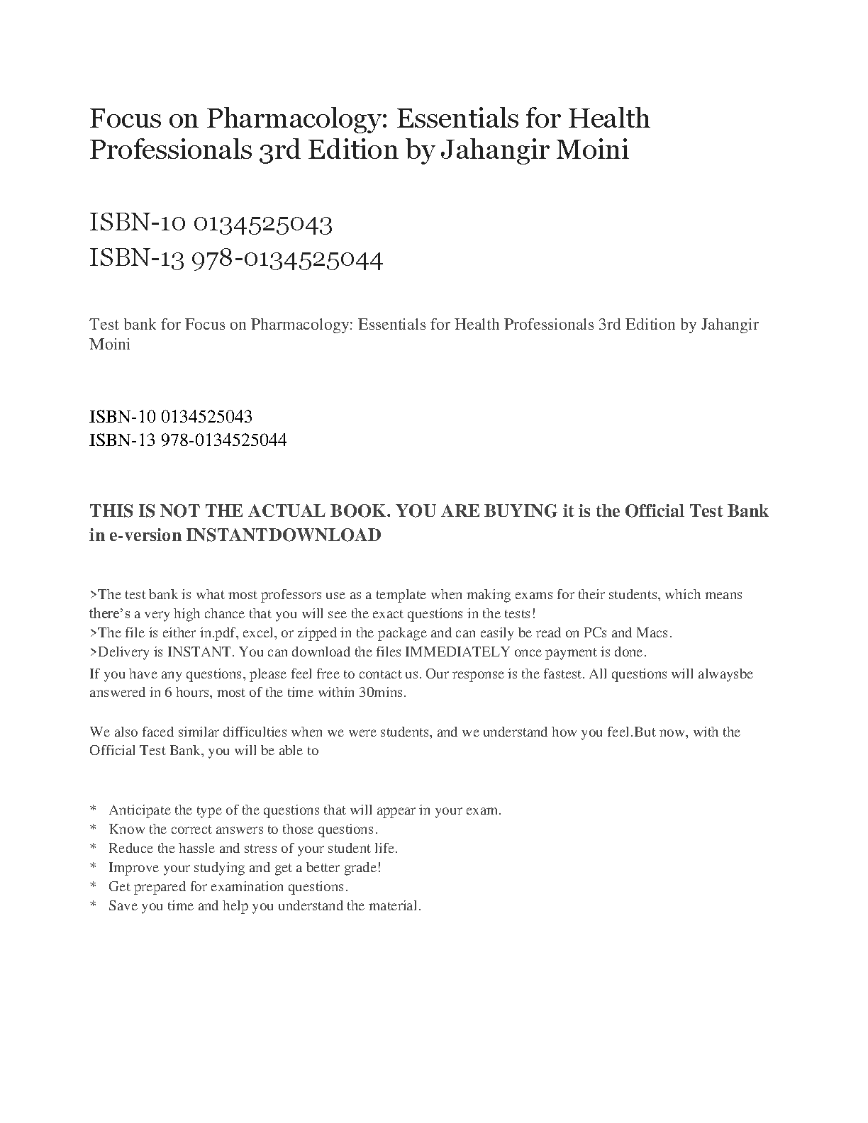 Get ready to ace your Pharmacology exams with this comprehensive test bank for Focus on Pharmacology 3rd Edition by Jahangir Moini. This resource is packed with practice questions covering all key concepts and essential clinical applications, ensuring you are thoroughly prepared for success.