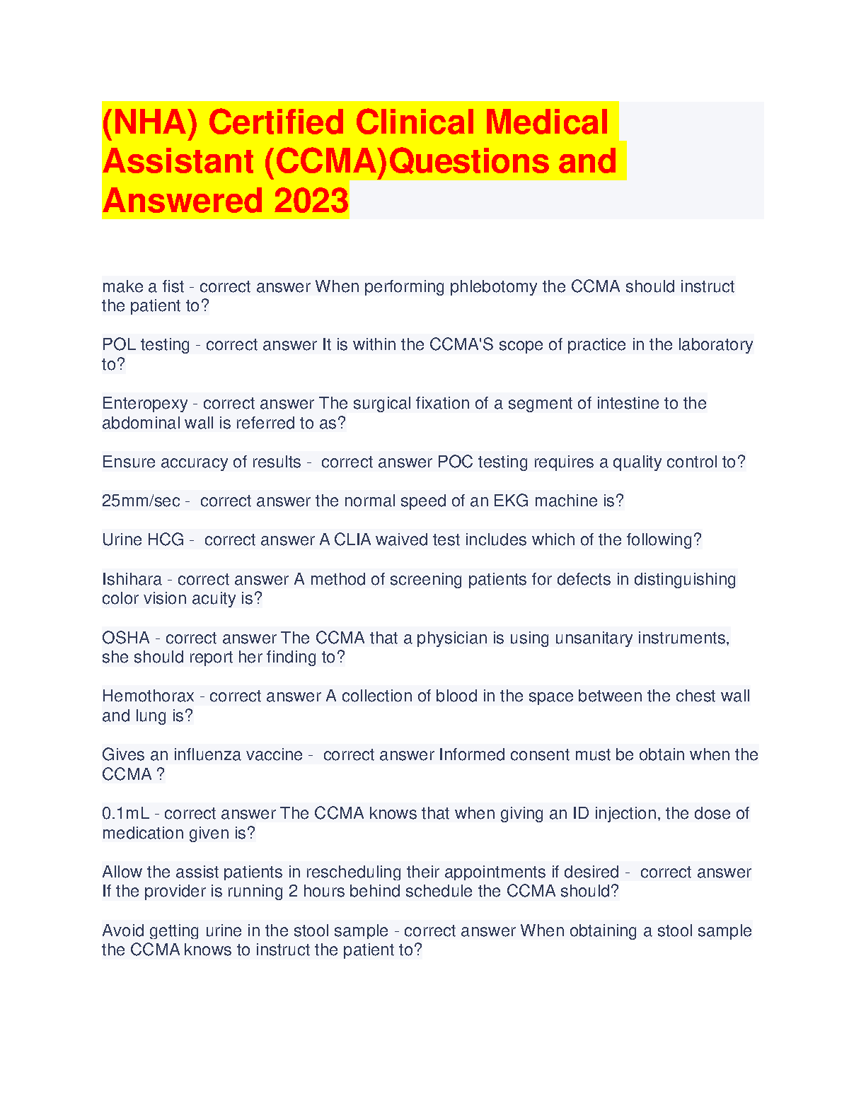 NHA Certified Clinical Medical Assistant (CCMA) Questions and Answers 2023 Edition - By [Author Name]