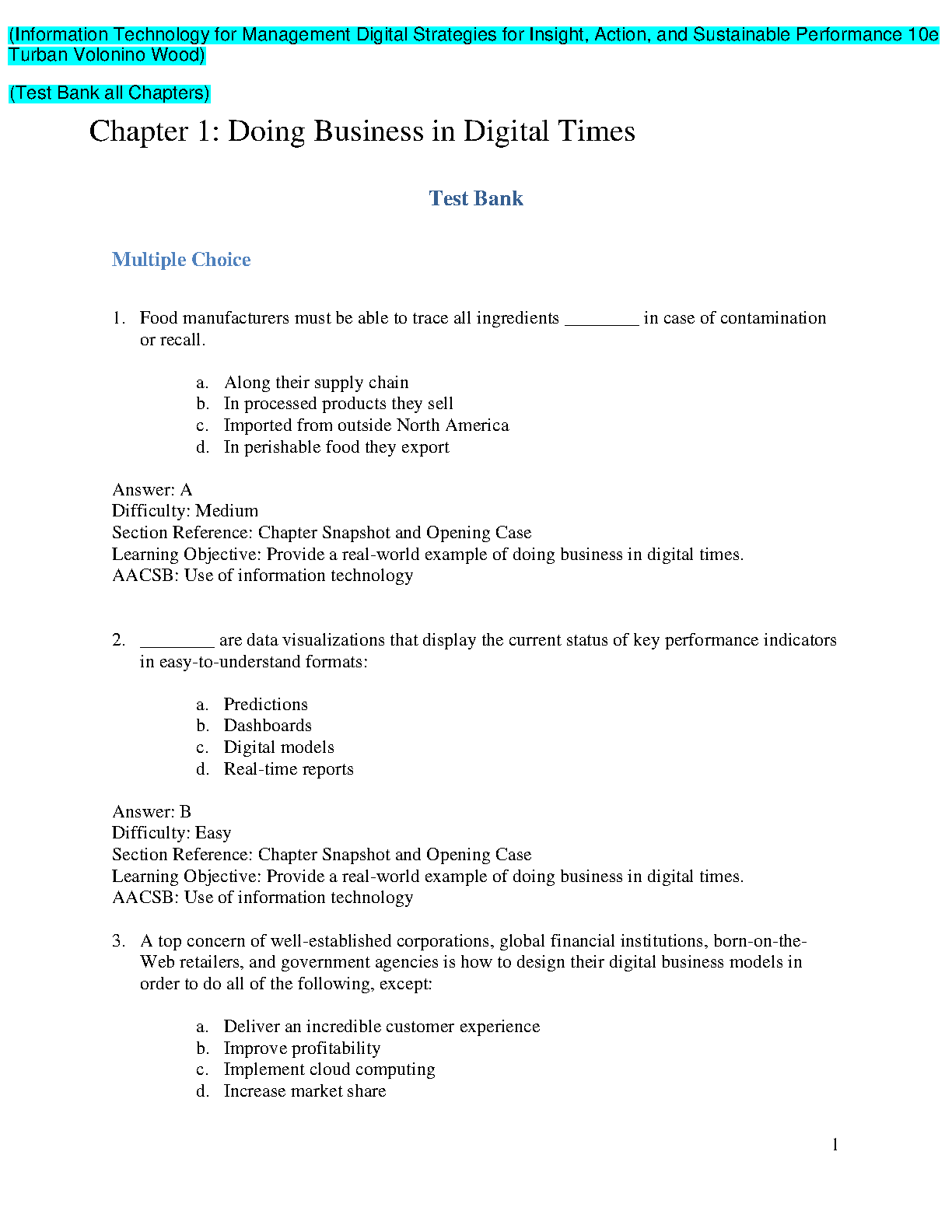 Ace your exams with this comprehensive test bank for Information Technology for Management: Digital Strategies for Insight, Action, and Sustainable Performance 10th Edition by Efraim Turban, David Leidner, Jay Lee, and David King.
