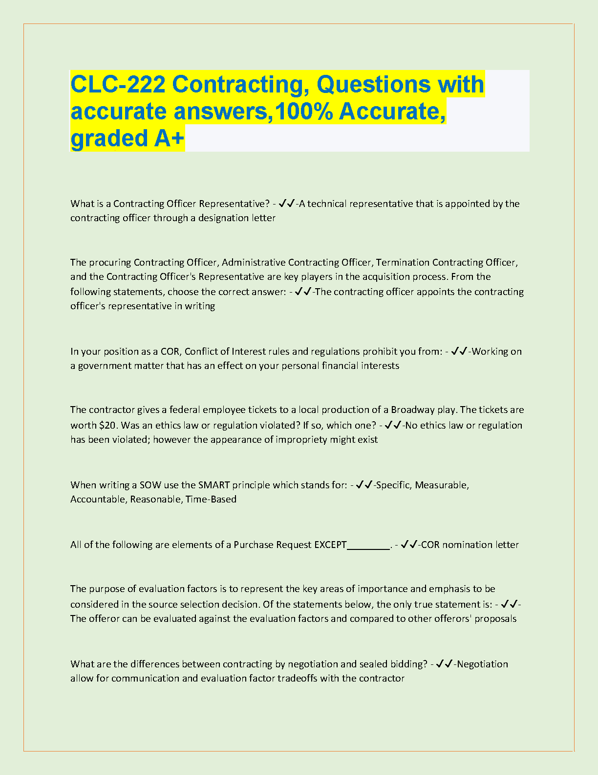 CLC-222 Contracting: Questions with Accurate Answers, 100% Accurate, Graded A+ - Latest Edition 2024/2025 - Pass Exams on the First Attempt