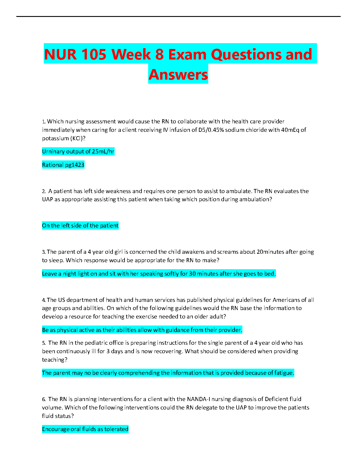 NUR 105 Week 8 Exam Questions and Answers - 2024/2025 Edition