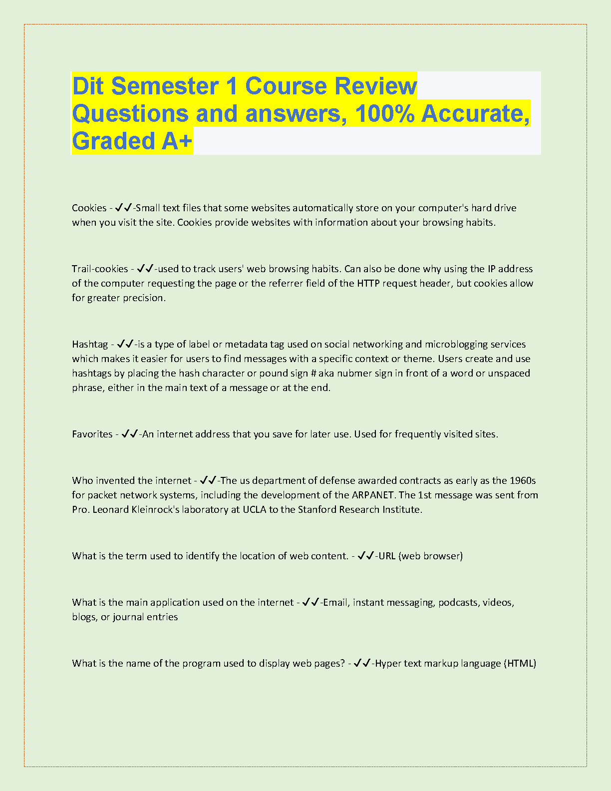 Dit Semester 1 Course Review Questions and Answers, 100% Accurate, Graded A+