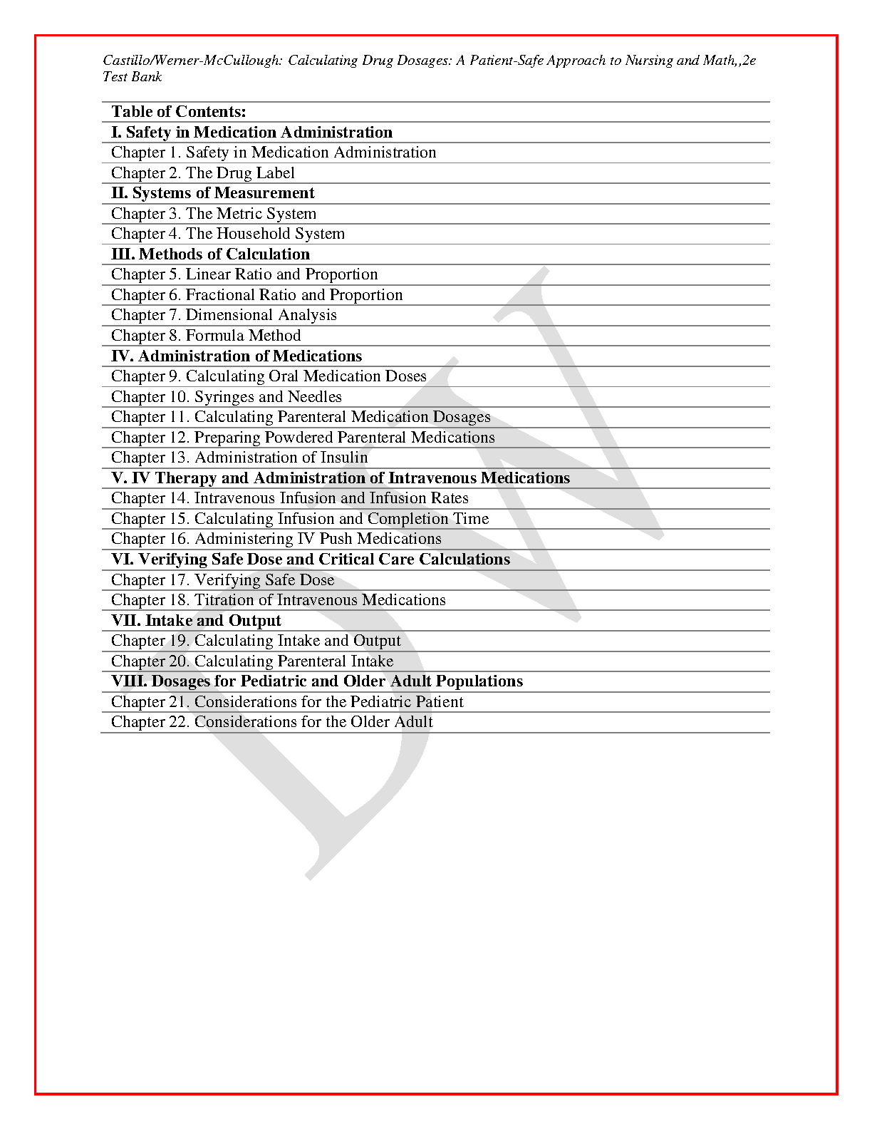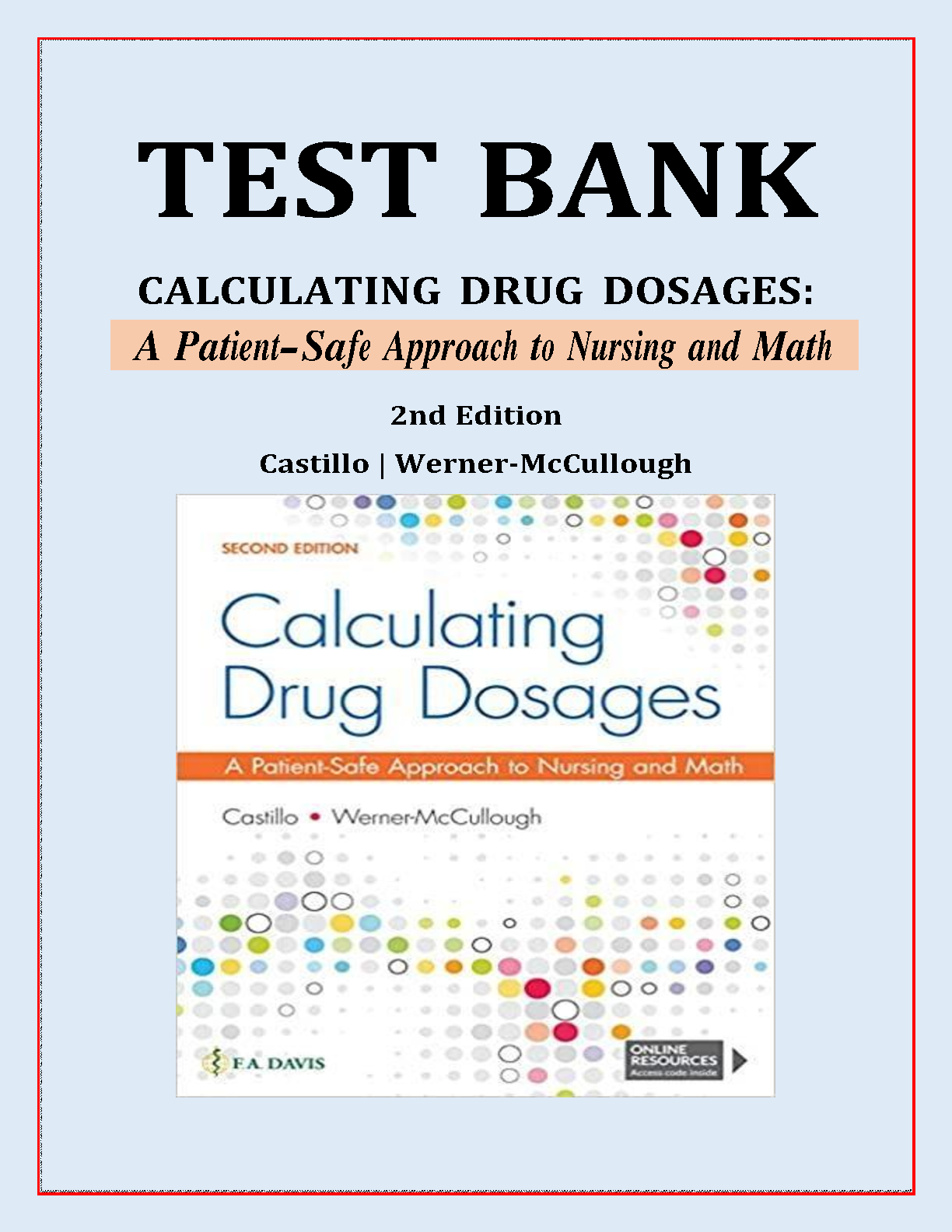 This test bank contains questions and answers for the textbook, Calculating Drug Dosages: A Patient-Safe Approach to Nursing and Math, 2nd Edition by Castillo and Werner-McCullough. This test bank is an essential study tool for nursing students to ace their exams.