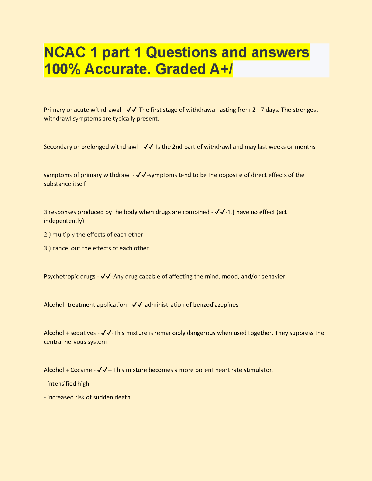 This resource contains practice questions and answers for NCAC 1 part 1. The content is 100% accurate and has been graded A+. These questions are designed to help students pass their exams on the first attempt, avoiding the need for resits.