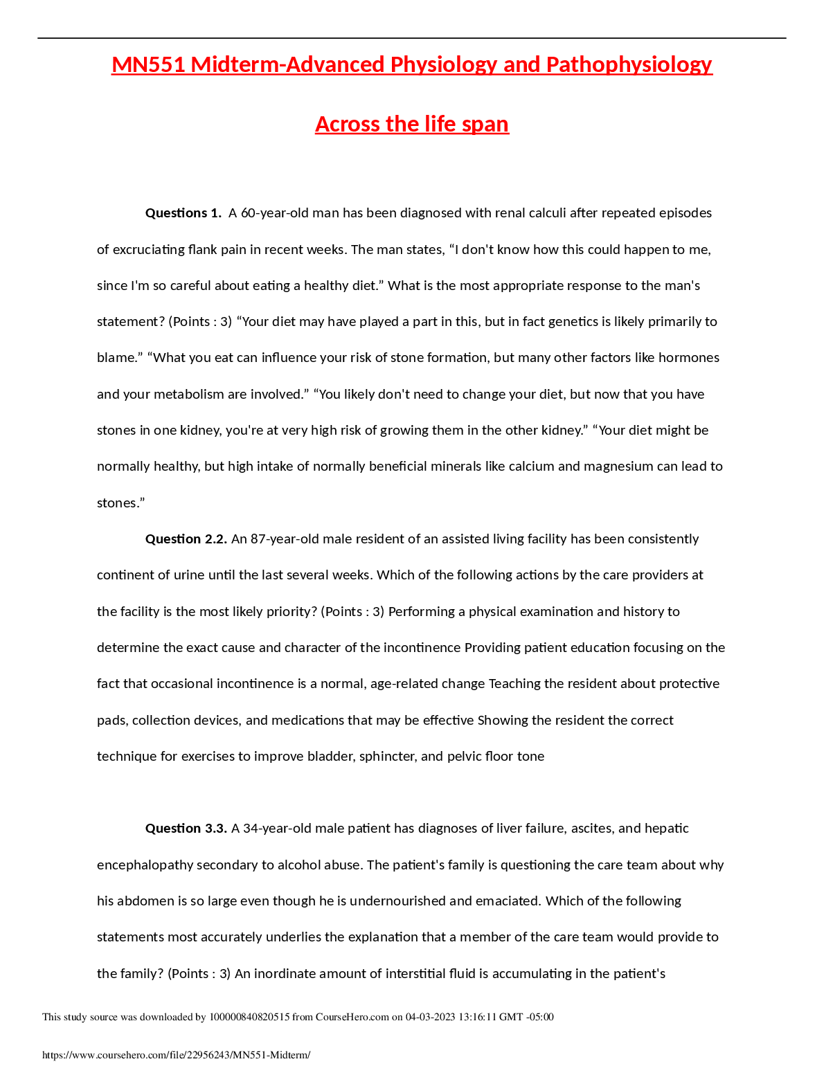 MN551 is a challenging course, but you can master it! Our study guide is designed to help you pass the MN551 Midterm exam on your first attempt. With detailed explanations, practice questions, and a comprehensive approach, this resource will equip you with the knowledge and confidence to excel in your studies. Get ready to tackle advanced physiology and pathophysiology concepts across the lifespan!