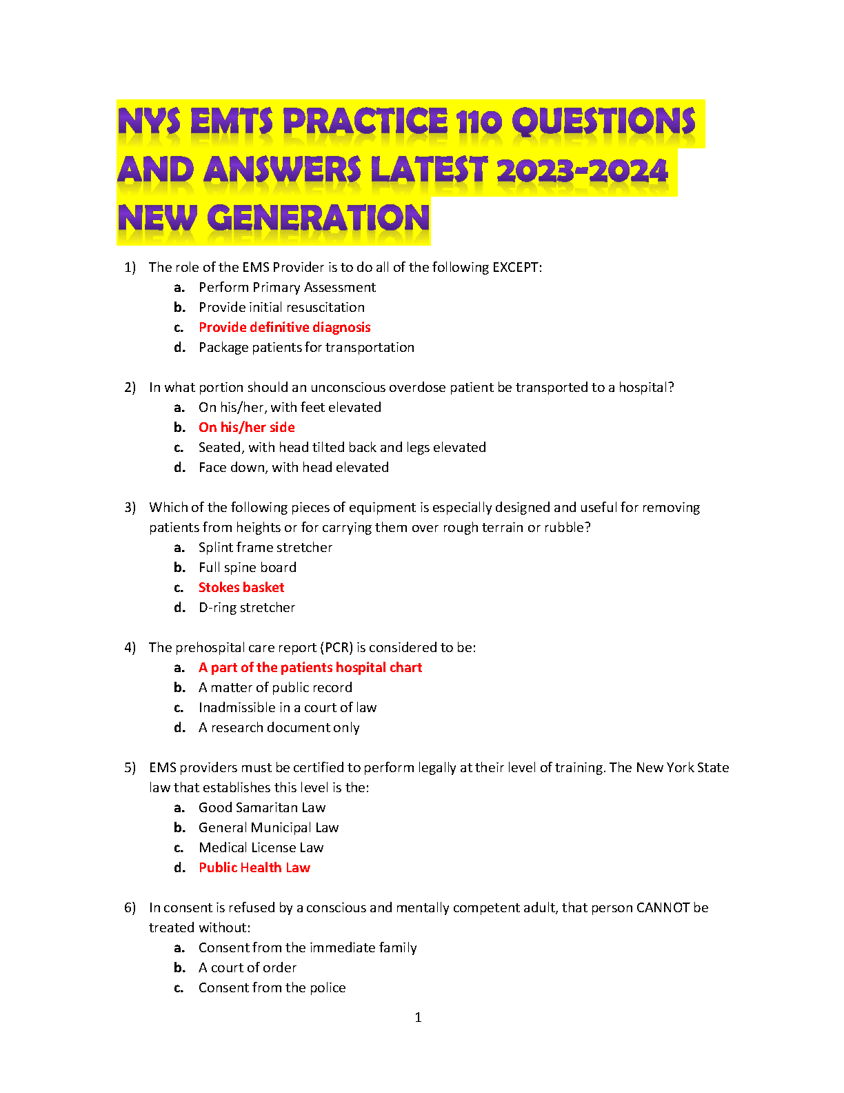 NYS EMTs Practice 110 Questions and Answers Latest 2023-2024 New Generation - by [Author Name]
