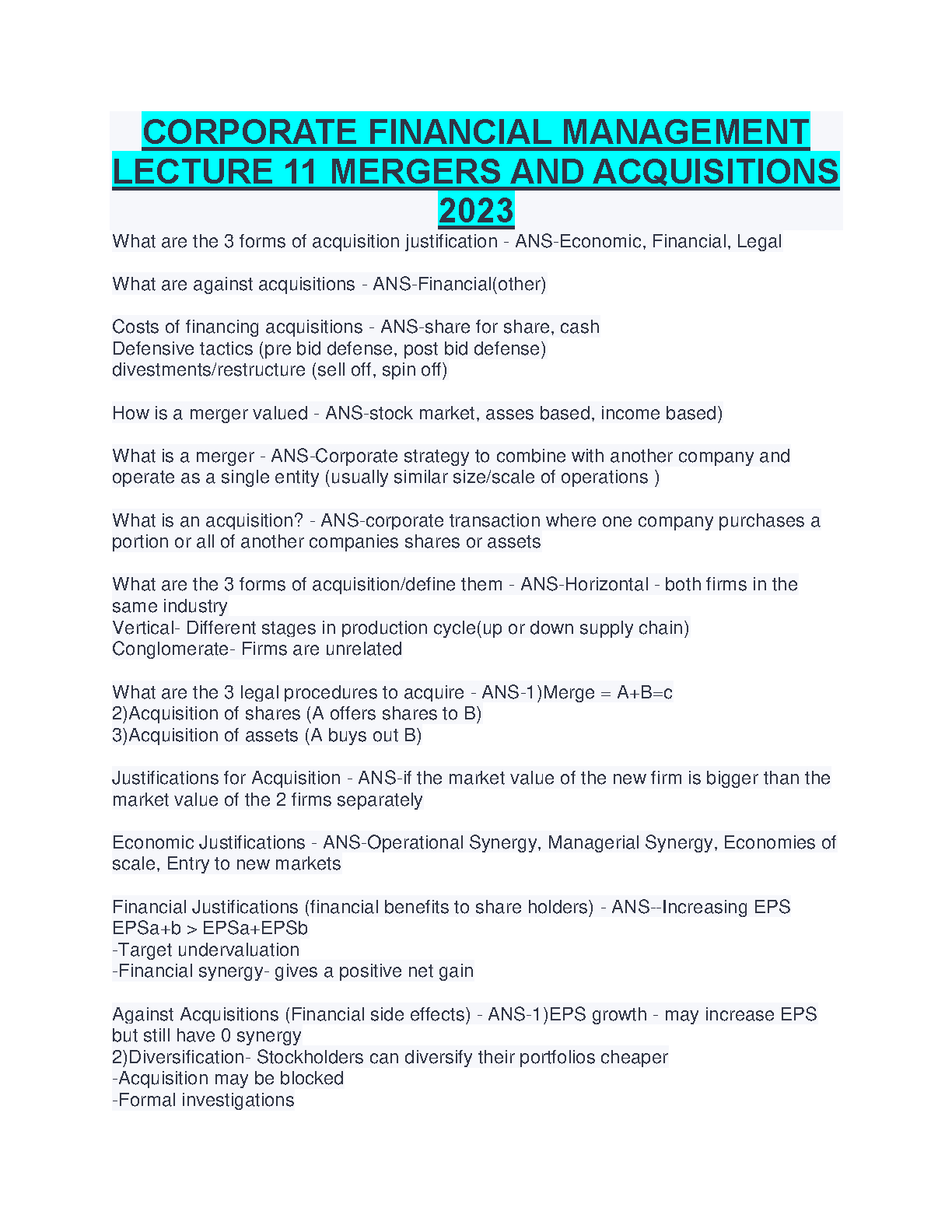 Corporate Financial Management: Lecture 11 - Mergers and Acquisitions 2023 Edition by [Author Name]