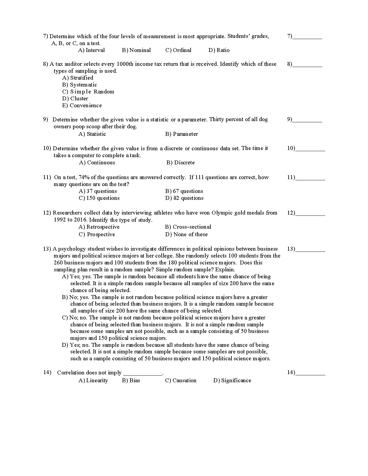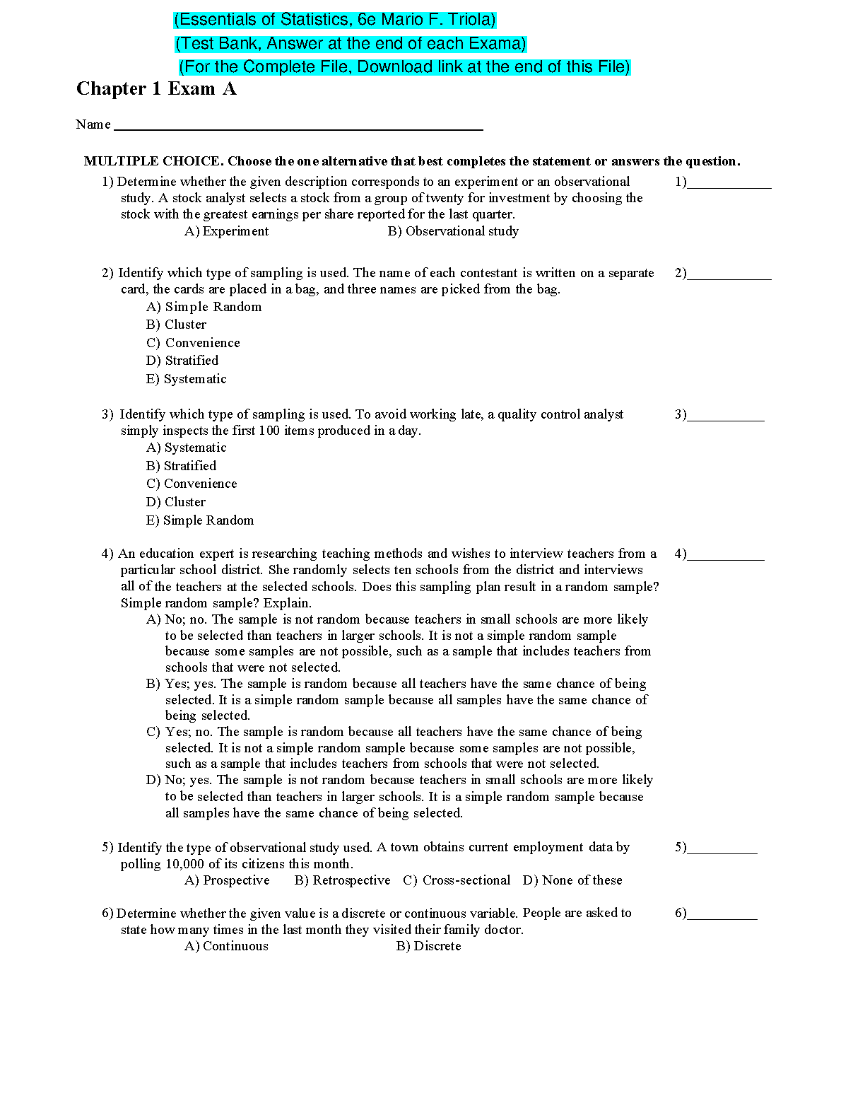 This comprehensive exam covers the key concepts of Chapter 1 in Essentials of Statistics, 6th Edition by Mario F. Triola. It provides a valuable opportunity to test your understanding of sampling methods, observational studies, and the nature of variables. Whether you're a student looking for practice or an instructor seeking assessment materials, this exam is an excellent resource for mastering the fundamentals of statistics.