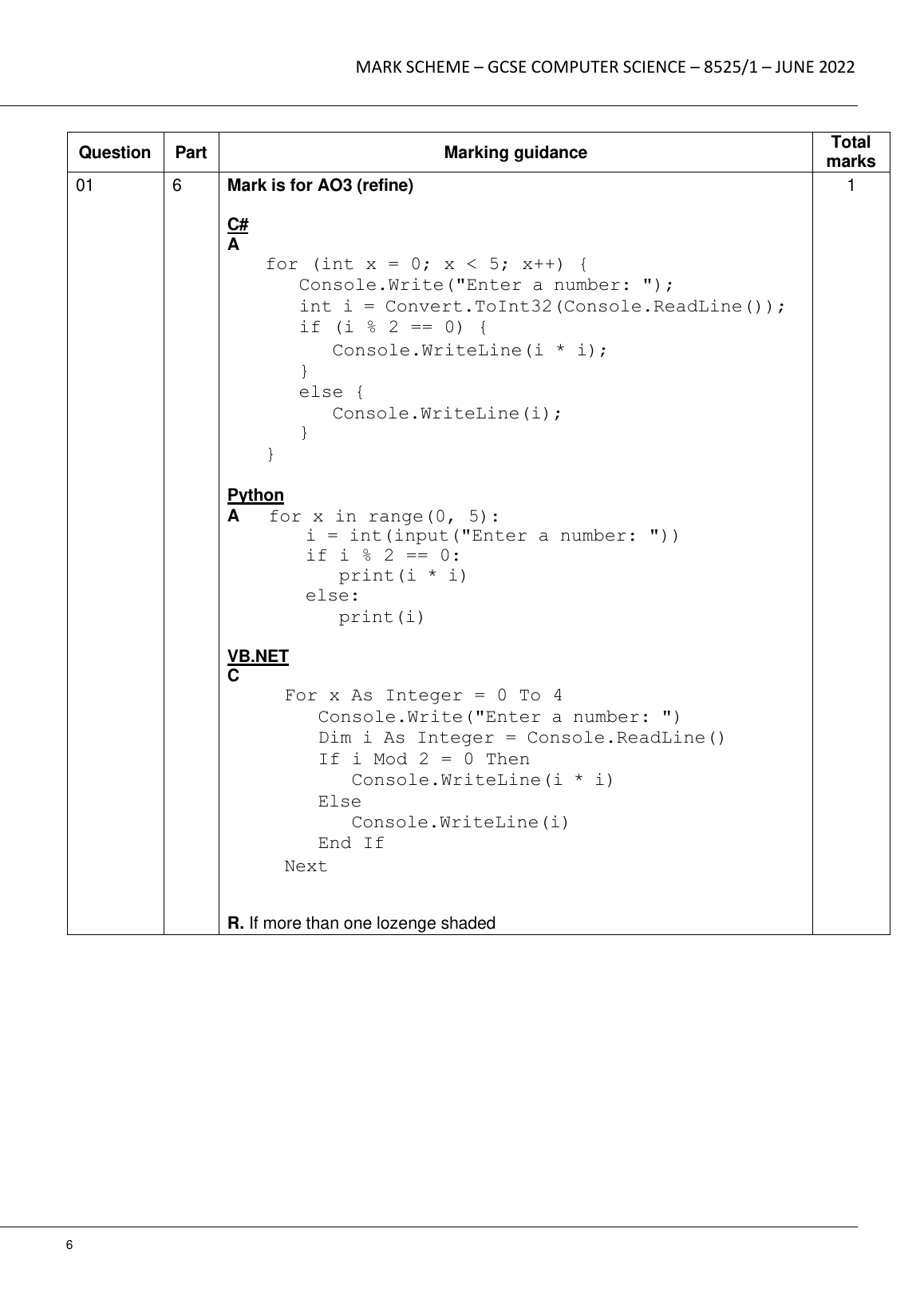 AQA GCSE COMPUTER SCIENCE PAPER 1 JUNE 2022 MARK SCHEME (8525/1A, 8525/1B, 8525/1C: Computational thinking and programming skills)
