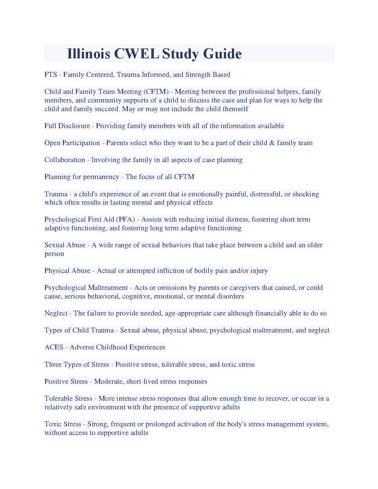 Ace your exams and avoid resits with this comprehensive Illinois CWEL study guide. This guide is crafted for the 2024/2025 academic year and covers all key topics including Trauma, neglect, and various types of abuse. Master the concepts of family-centered, trauma-informed, and strength-based approaches, including the nuances of various types of stress.