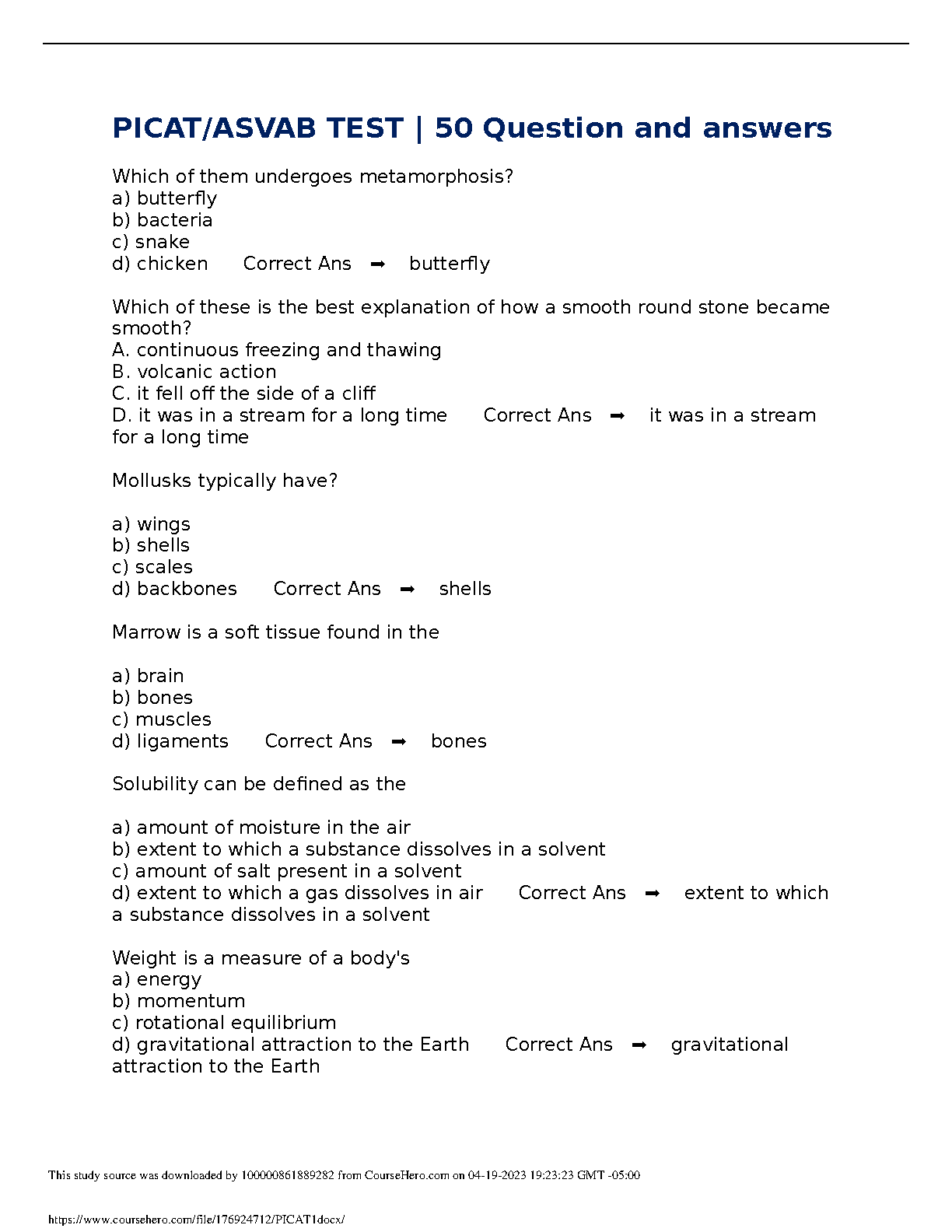 PICAT/ASVAB Test 50 Question and Answers for 2024/2025