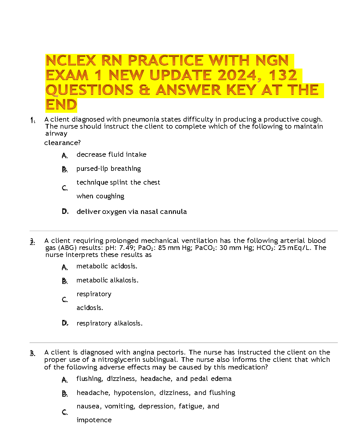 NCLEX-RN Practice with NGN Exam 1 New Update 2024, 132 Questions & Answer Key at the End: Pass Your Exam on the First Attempt