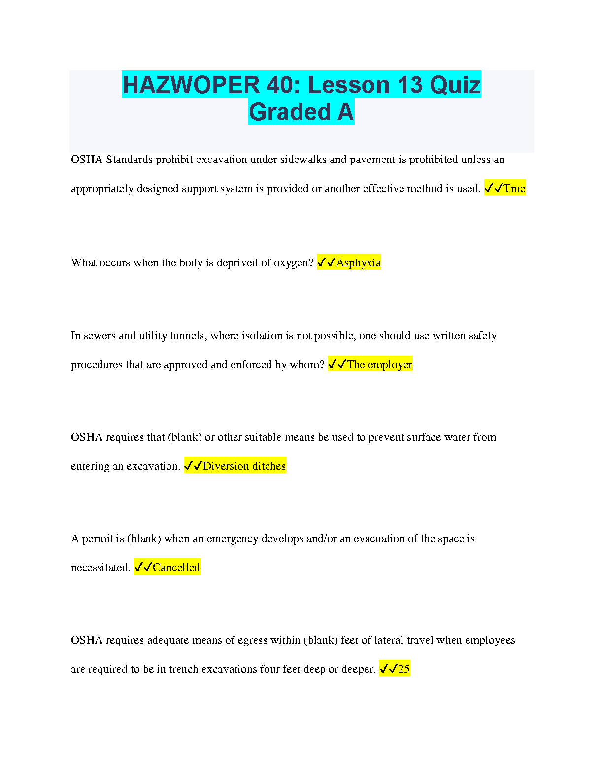 HAZWOPER 40: Lesson 13 Quiz Graded A - 2024 Edition - Pass Your Exam on the First Attempt