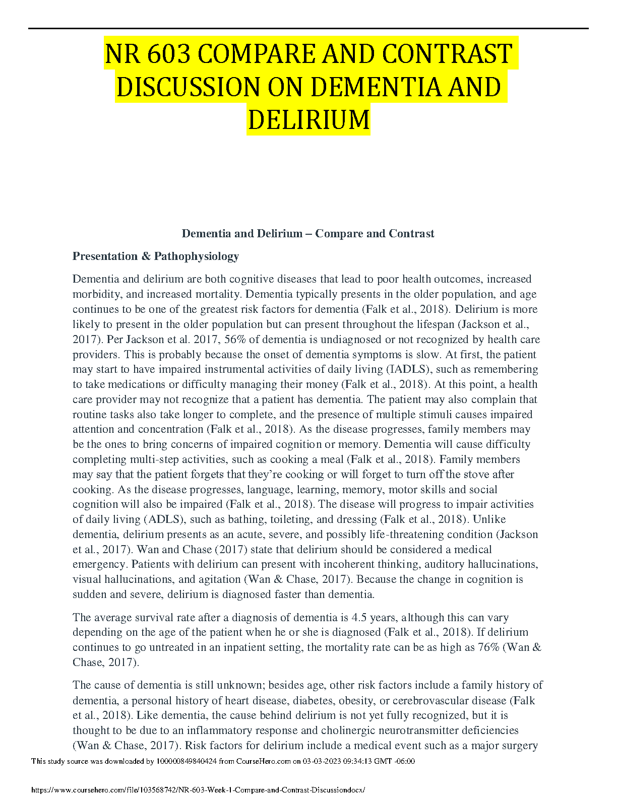 This NR 603 Week 1 Compare and Contrast Discussion on Dementia and Delirium by Falk, Jackson, Wan & Chase (2017, 2018) is a comprehensive resource that provides an in-depth comparison of dementia and delirium. The resource covers the presentation and pathophysiology of both conditions, highlighting key differences and similarities.