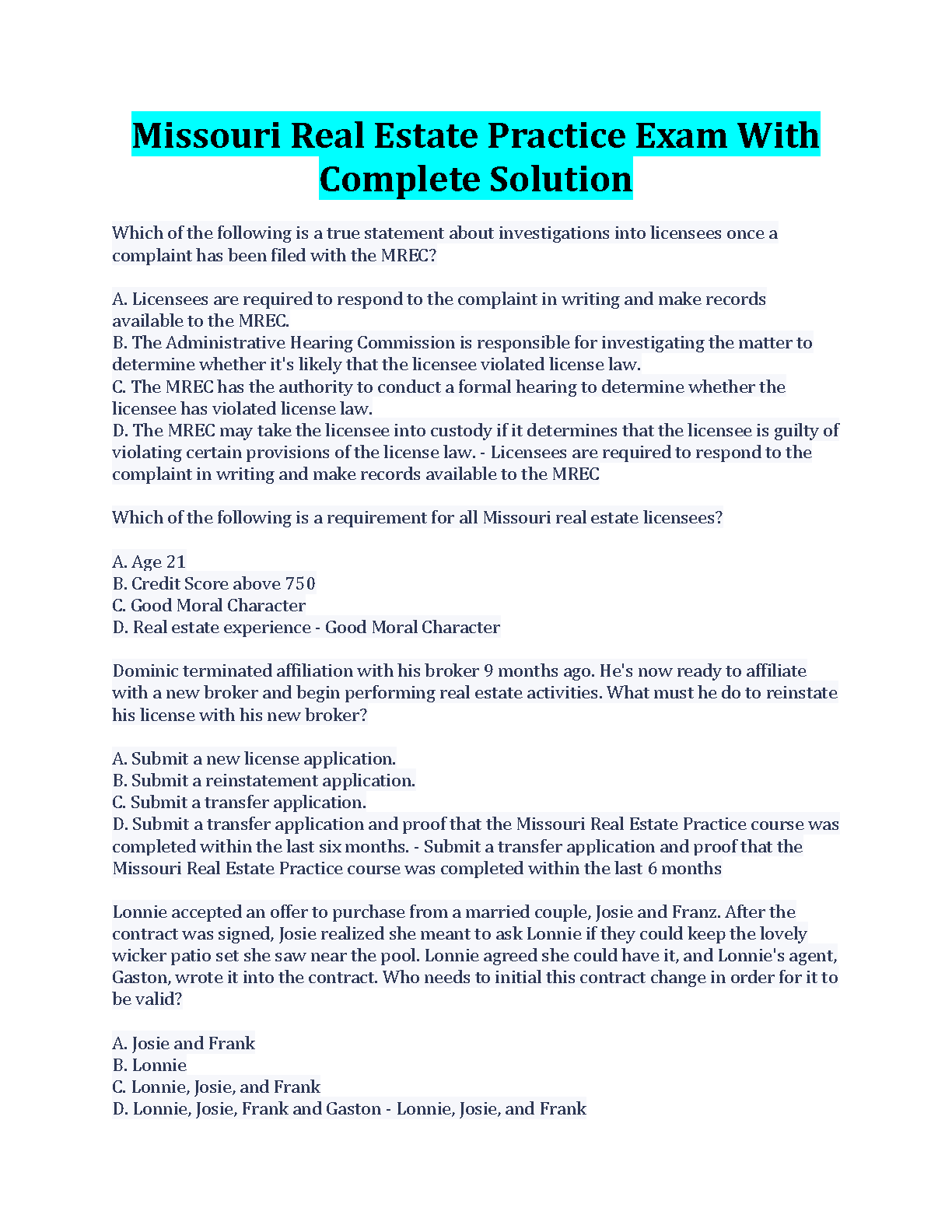 Get ready to conquer your Missouri Real Estate Practice Exam with this comprehensive study guide! Packed with practice questions, exam-style scenarios, and in-depth explanations, this resource is your secret weapon for achieving success. Mastering this material will boost your confidence and ensure you're fully prepared for your exam.