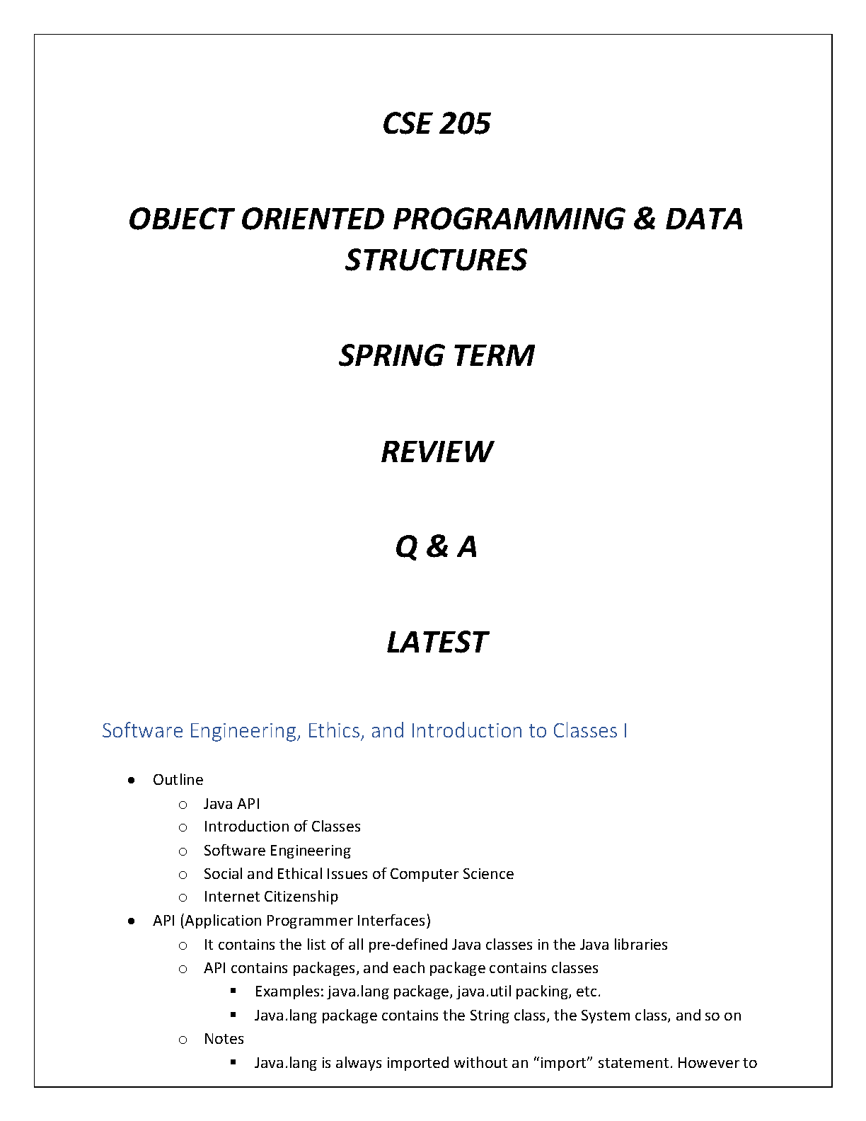 CSE 205 Object-Oriented Programming & Data Structures: Spring Term Review Q&A - Latest Edition - Ace Your Exams!