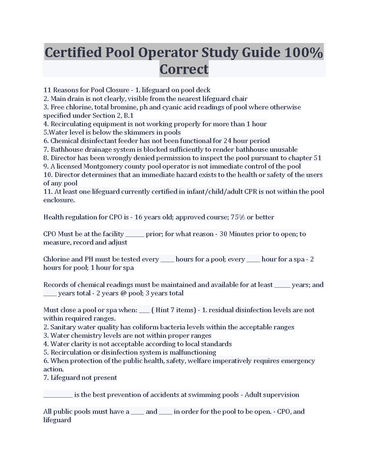 Certified Pool Operator Study Guide 100% Correct - Latest Edition for Passing Exams on the First Attempt