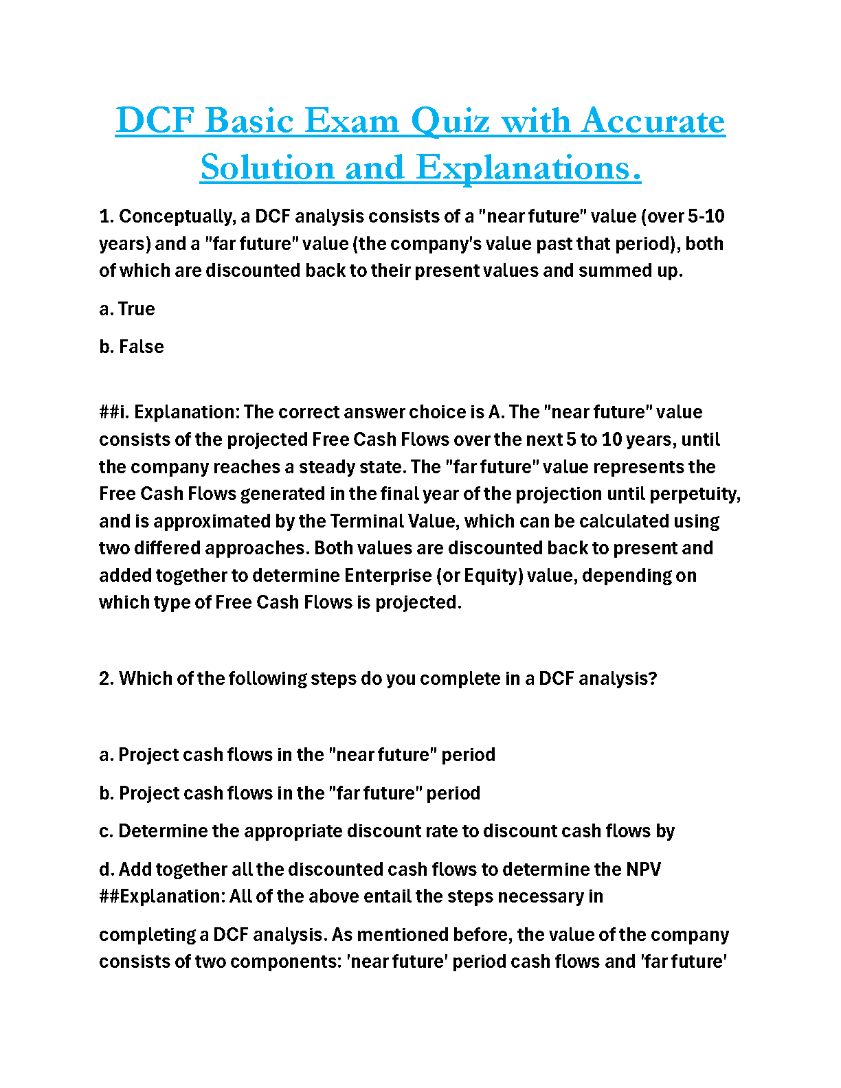 This comprehensive quiz covers the fundamentals of DCF analysis, helping you master the concepts of "near future" and "far future" value. With detailed explanations, this resource is ideal for students preparing for exams and aiming for a first-time pass.