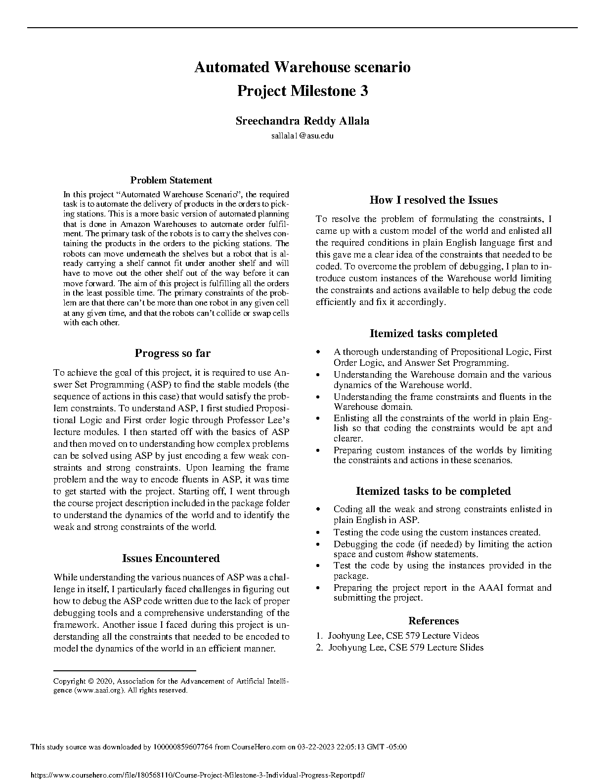 This resource provides an in-depth analysis of the Automated Warehouse scenario project, focusing on the individual progress made during milestone 3. It delves into the challenges faced in understanding the intricacies of Answer Set Programming (ASP), particularly in modelling the dynamics of the world. This comprehensive report outlines the solutions implemented to overcome these obstacles, including the creation of custom instances of the Warehouse world to help debug the code efficiently. The report also provides a detailed overview of the tasks completed and those still pending. This comprehensive guide is designed to help students grasp the complexities of ASP and achieve success in their own warehouse automation projects.