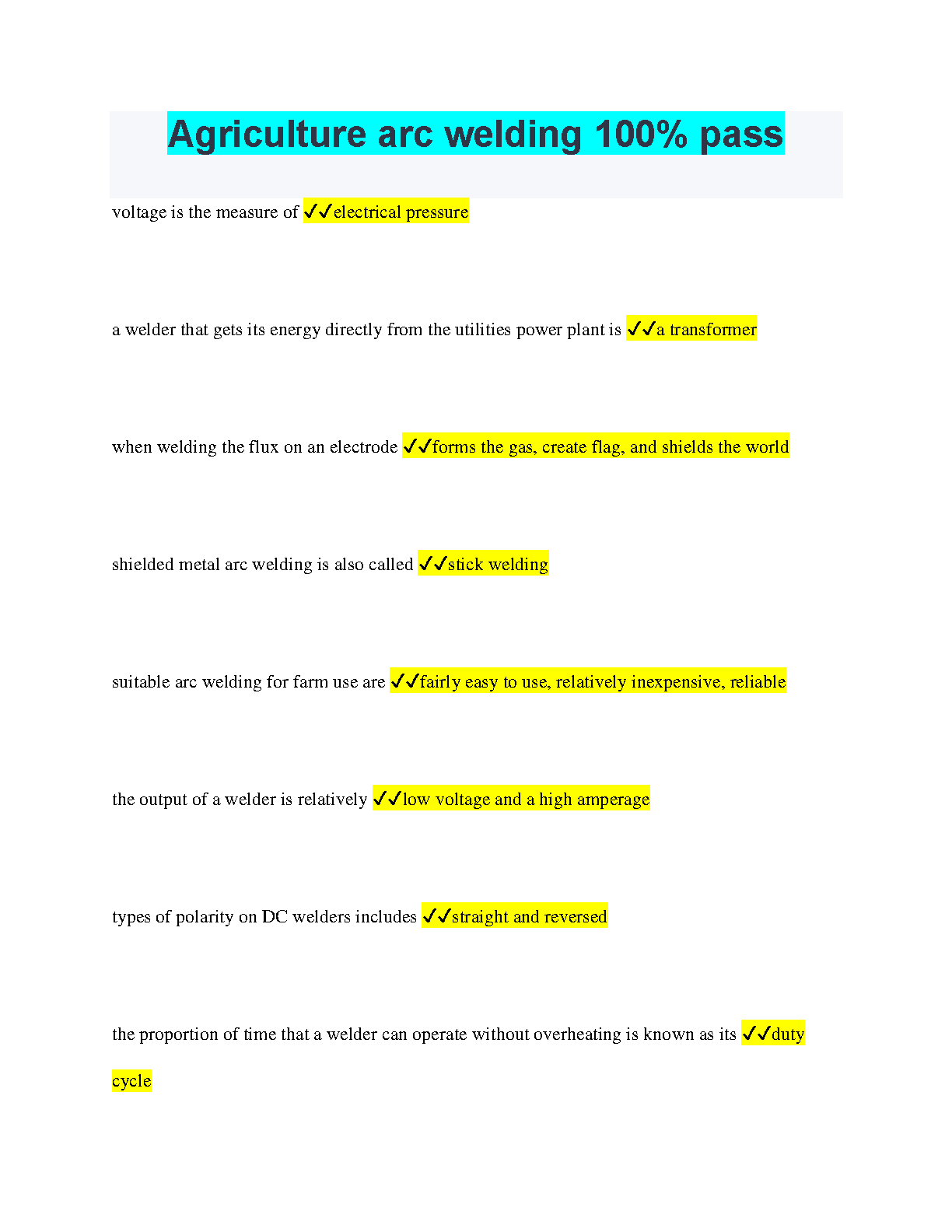 Agriculture Arc Welding 100% Pass: Study Guide for First Attempt Success (2024/2025)