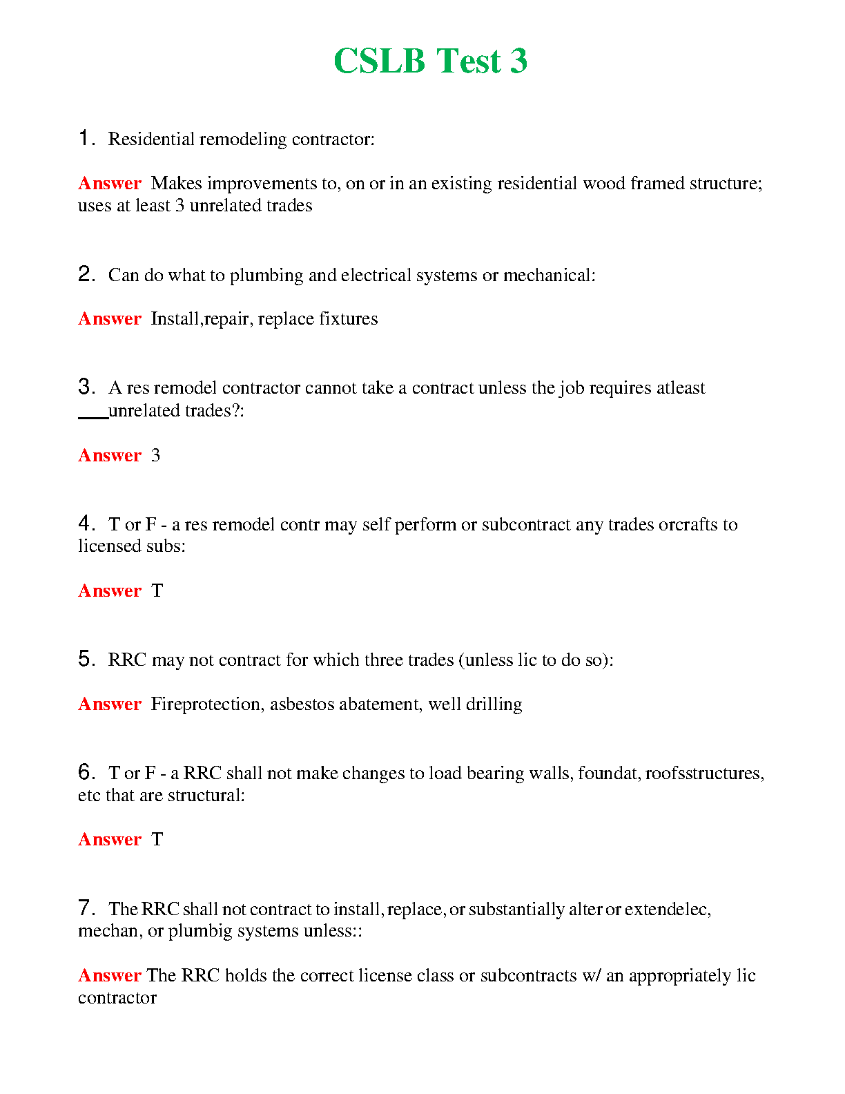 CSLB Test 3 Practice Questions and Answers for 2024/2025