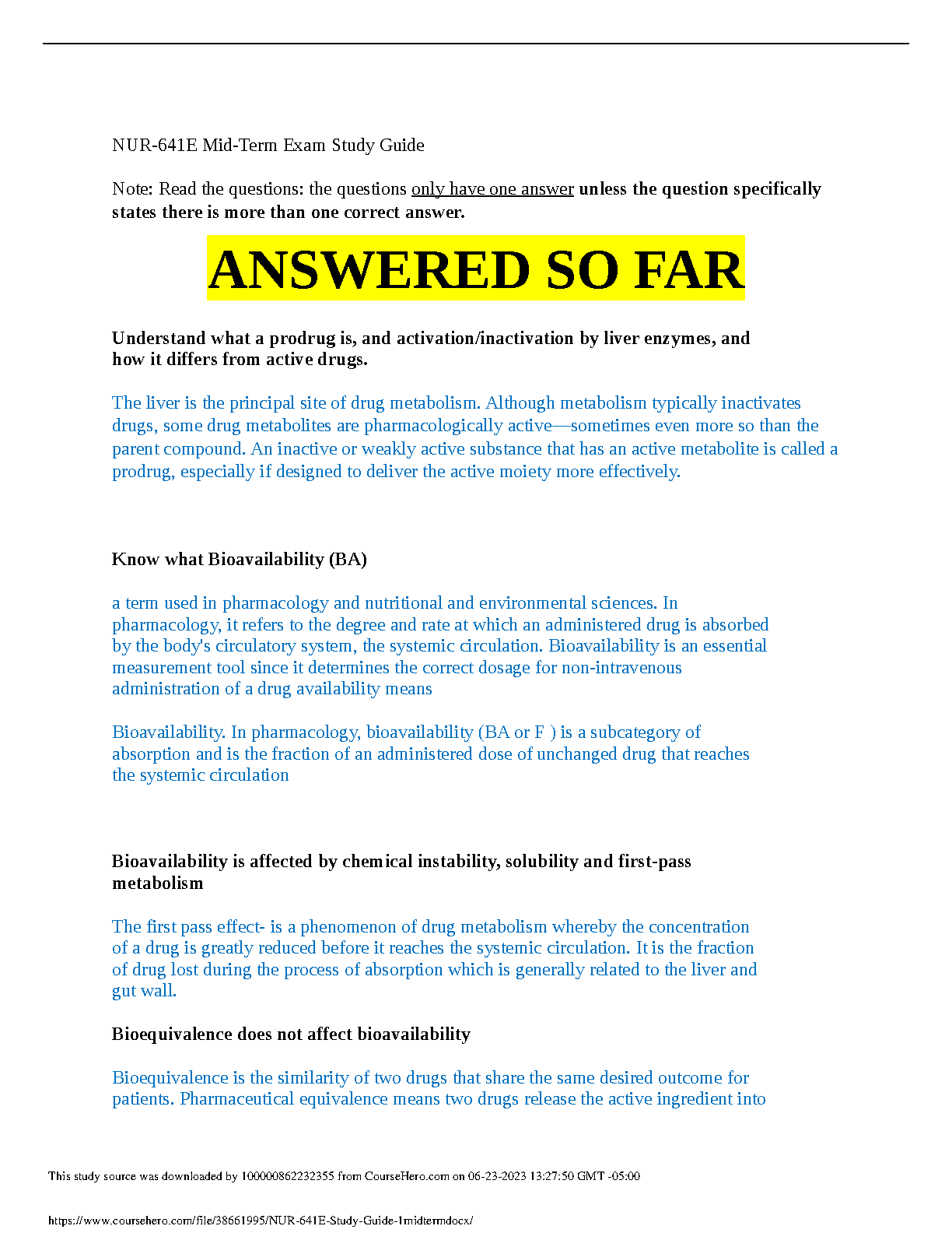 This comprehensive study guide for NUR-641E is designed to help students achieve success on their first attempt at the mid-term exam. The guide covers essential concepts such as bioavailability, drug metabolism, and bioequivalence, providing clear explanations and insightful examples. It's a valuable resource for students seeking to master the course material and improve their understanding of key pharmaceutical principles.