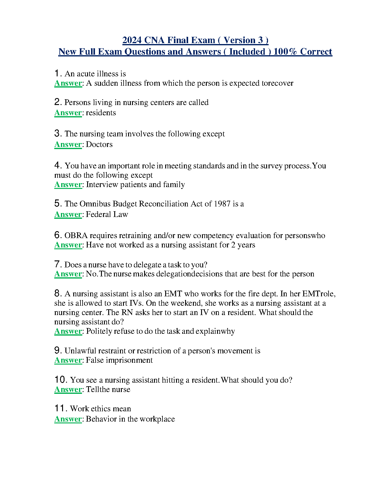 2024 CNA Final Exam (Version 3) - Practice Questions and Answers for Success