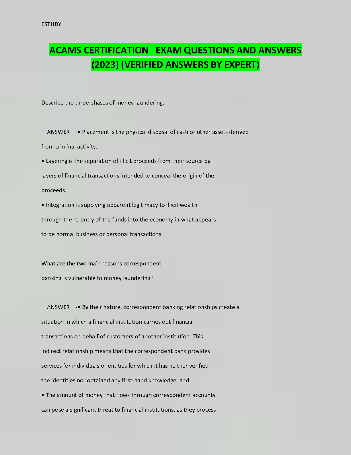 ACAMS CERTIFICATION EXAM QUESTIONS AND ANSWERS (2023) (VERIFIED ANSWERS BY EXPERT)