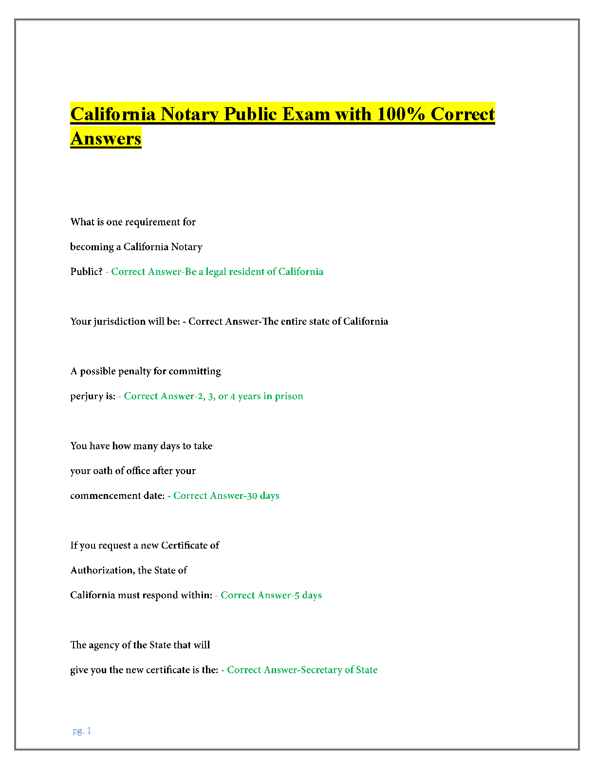 Ace your California Notary Public exam on the first try with this comprehensive guide featuring 100% correct answers. This resource covers all essential topics, including requirements, jurisdiction, penalties, and more. Get a head start on your notary career with this must-have study tool!