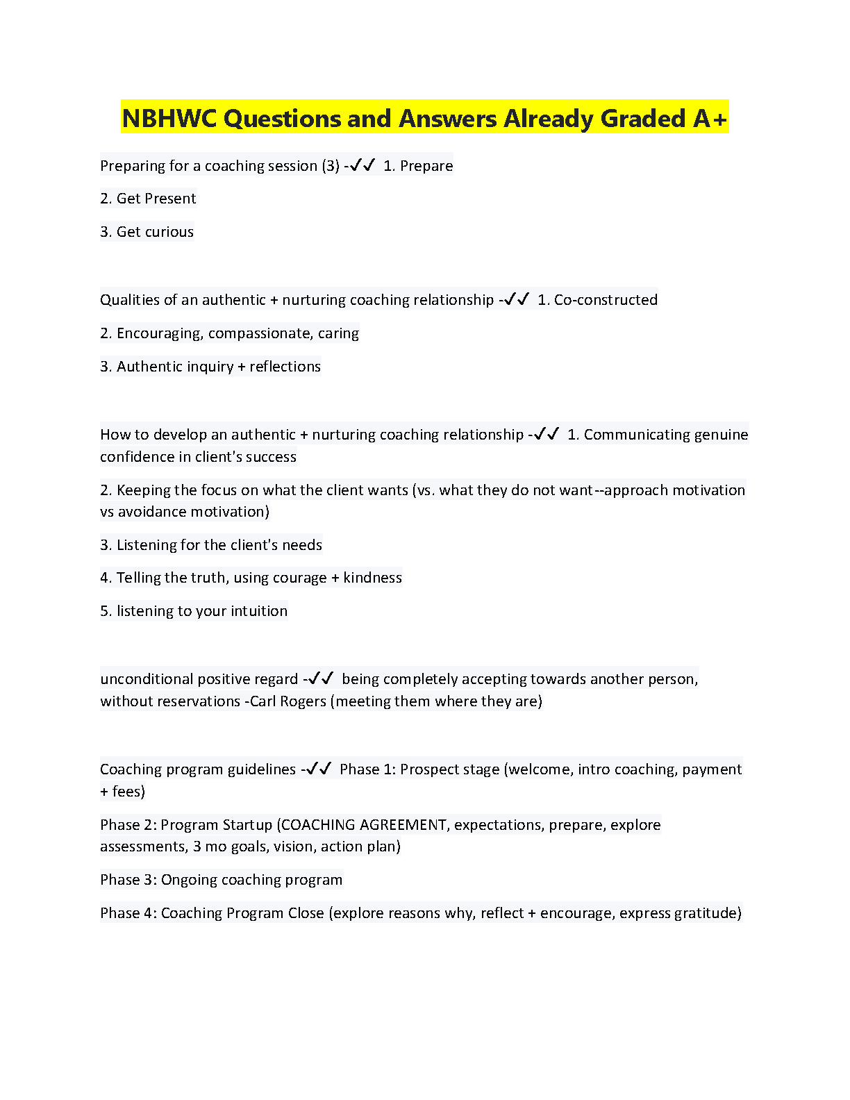 This resource provides a comprehensive set of NBHWC questions and answers, all graded A+ for your convenience. These questions and answers will help you master the material and ace your next exam, ensuring you avoid resits and achieve academic success.