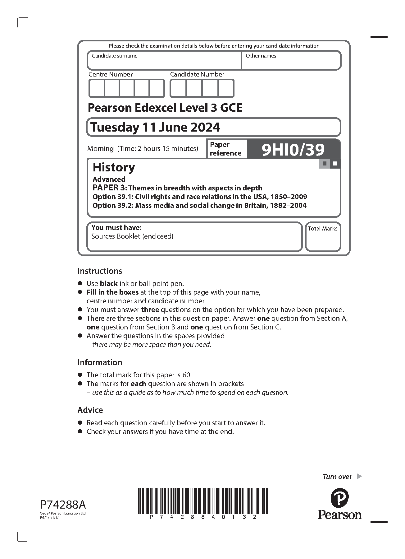 PEARSON EDEXCEL A LEVEL HISTORY QUESTION PAPER 3 2024 (9HI0/39: Themes in breadth with aspects in depth Option 39.1: Civil rights and race relations in the USA, 1850–2009 Option 39.2: Mass media and social change in Britain, 1882–2004). DOWNLOAD THE OFFICIAL AND VERIFIED ON www.hackedexams.com INSTANTLY