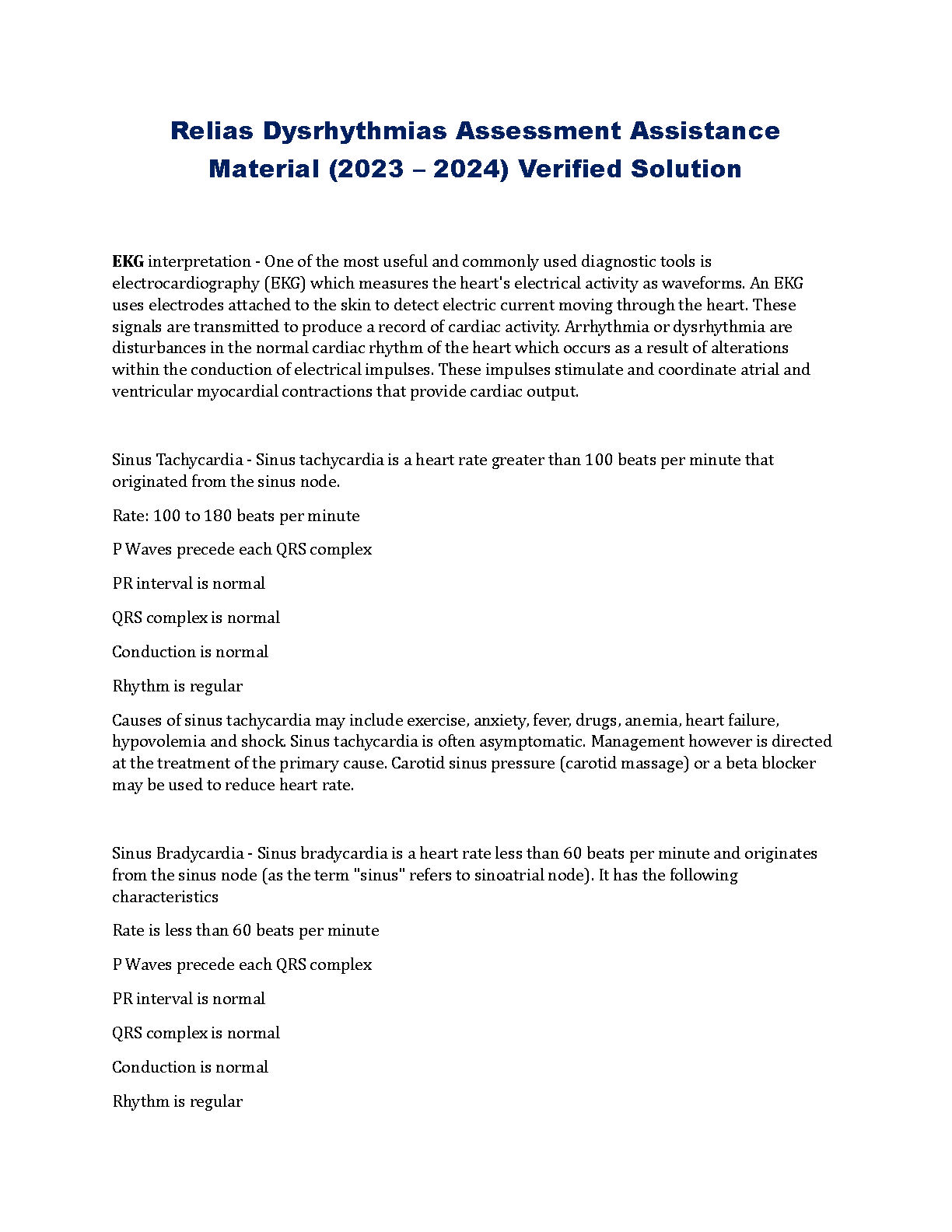 Relias Dysrhythmias Assessment Assistance Material (2023 - 2024) Verified Solution - Master Dysrhythmias With This Comprehensive Study Guide