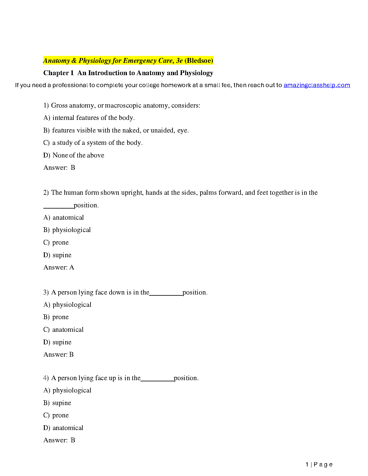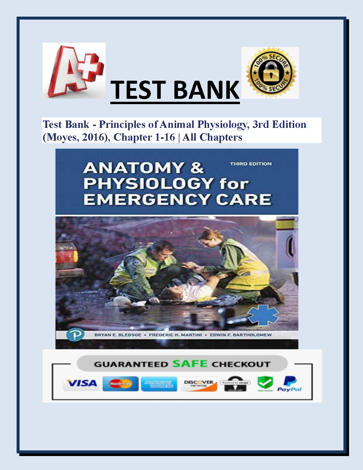 Access an extensive test bank for Anatomy and Physiology for Emergency Care, 3rd Edition, written by Bryan E. Bledsoe, Frederic H. Martini, and Edwin F. Bartholomew. This comprehensive resource contains a wide range of questions to ensure your understanding of all chapters, from 1 to 16. Practice and test your knowledge effectively with this essential study tool.