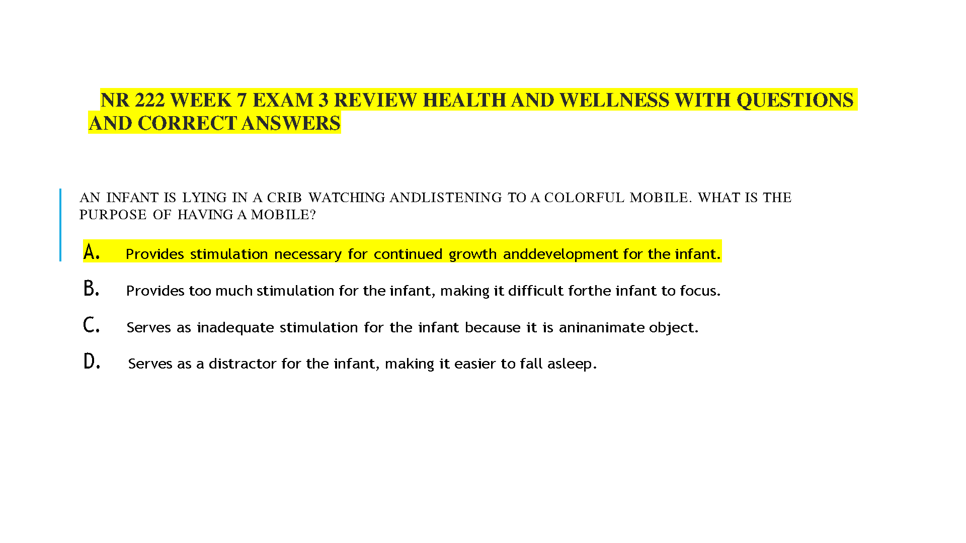 This resource is a comprehensive review of health and wellness topics covered in NR 222 Week 7 Exam 3. It includes questions and correct answers to help you prepare for your exam and ace it on the first attempt. This guide will enable you to avoid resits and ensure your academic success.