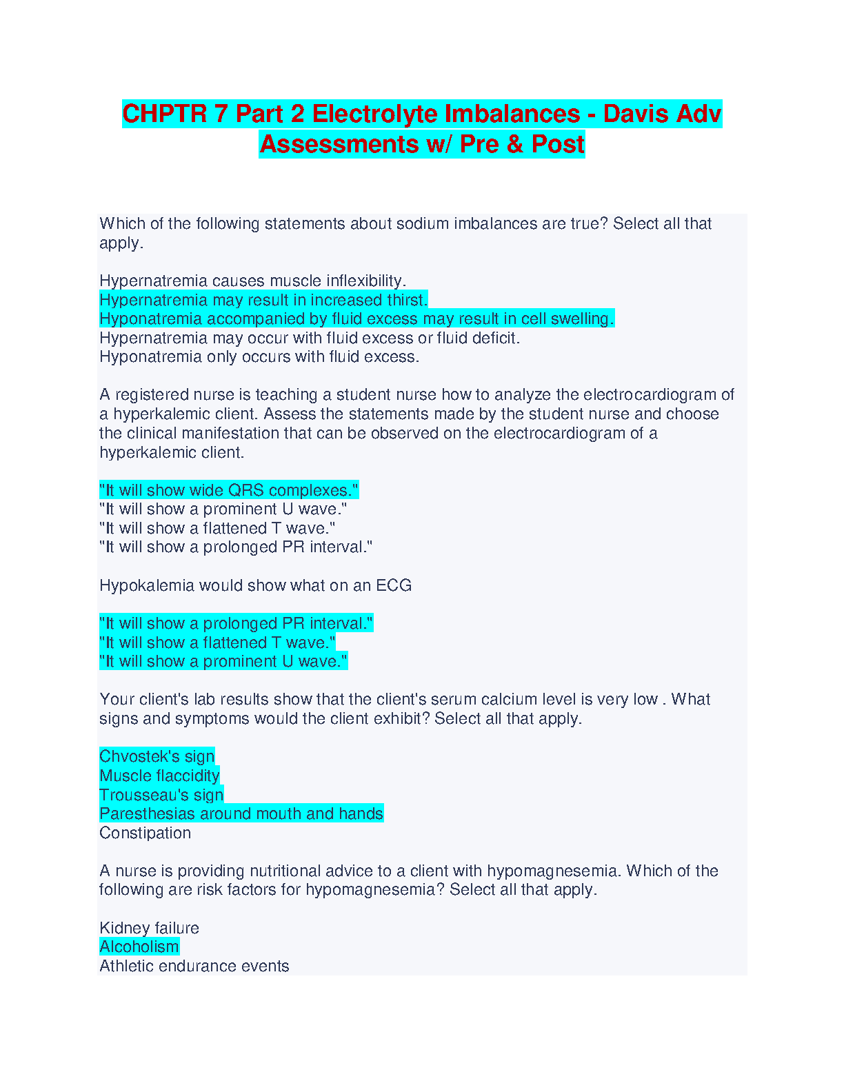 Master Electrolyte Imbalances with this comprehensive resource! This study guide, tailored for the 3rd edition of Davis Advantage for Medical-Surgical Nursing, will help you ace your exams and avoid resits.