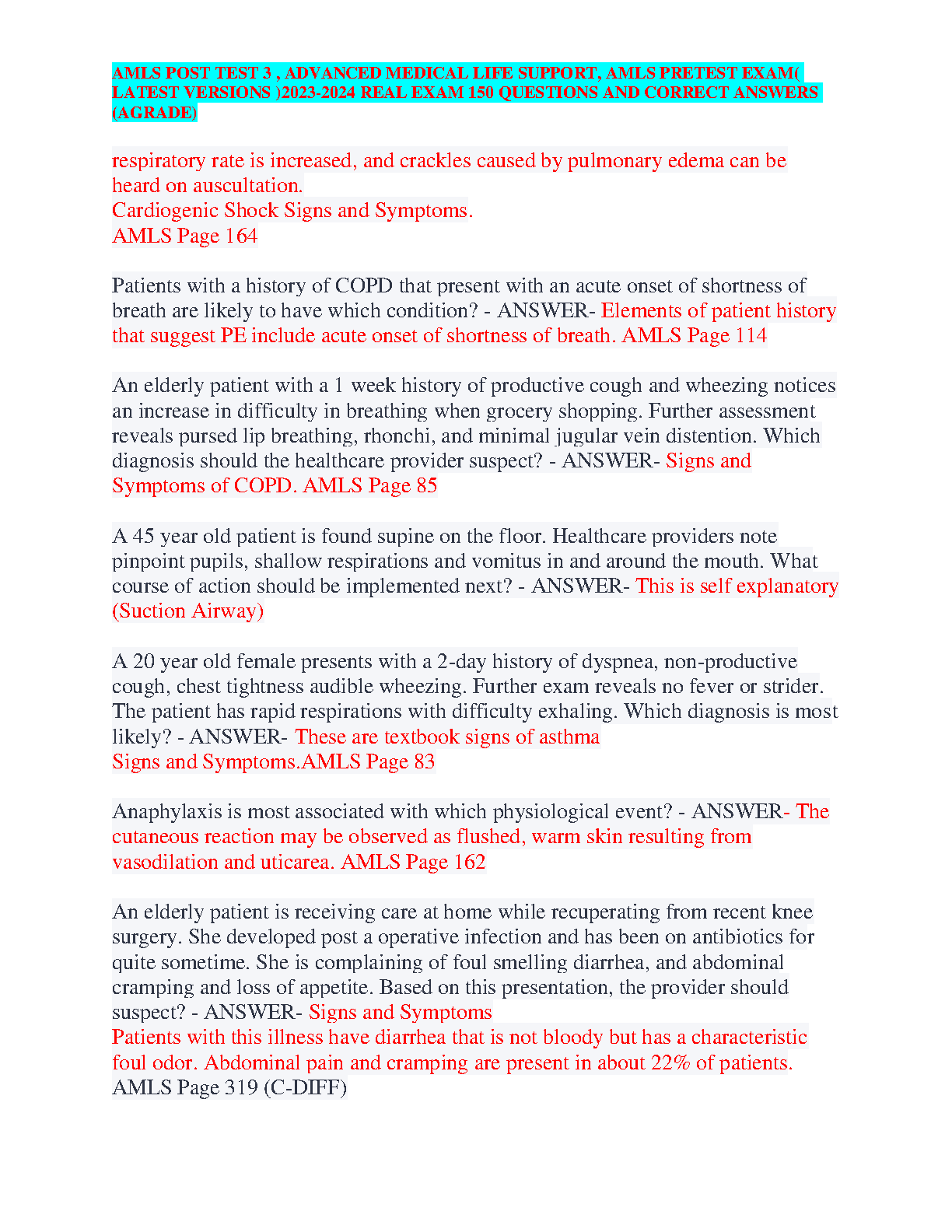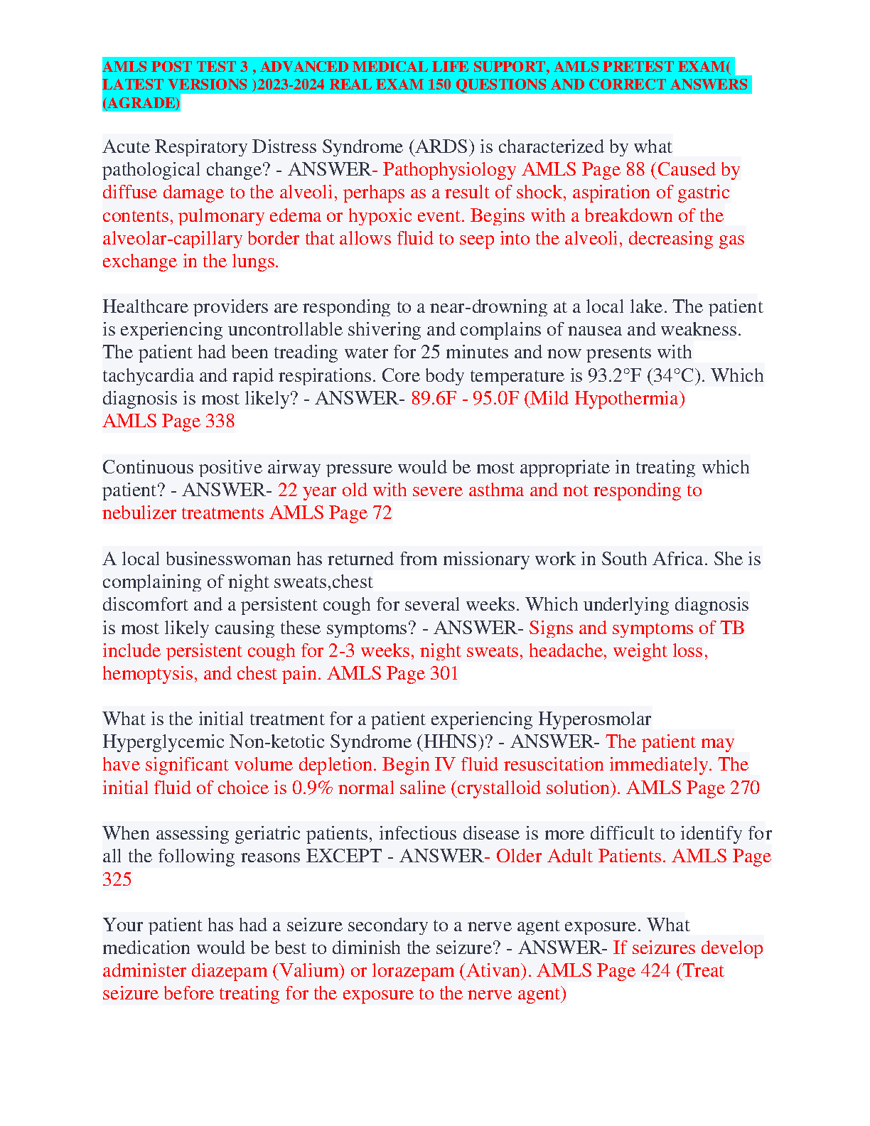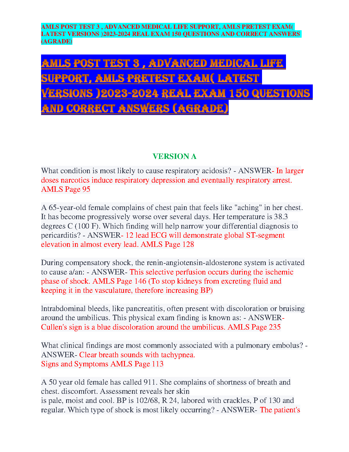 AMLS Post Test 3: Advanced Medical Life Support, AMLS Pretest Exam (Latest Versions) 2023-2024 Real Exam 150 Questions and Correct Answers (A Grade) - Edition A