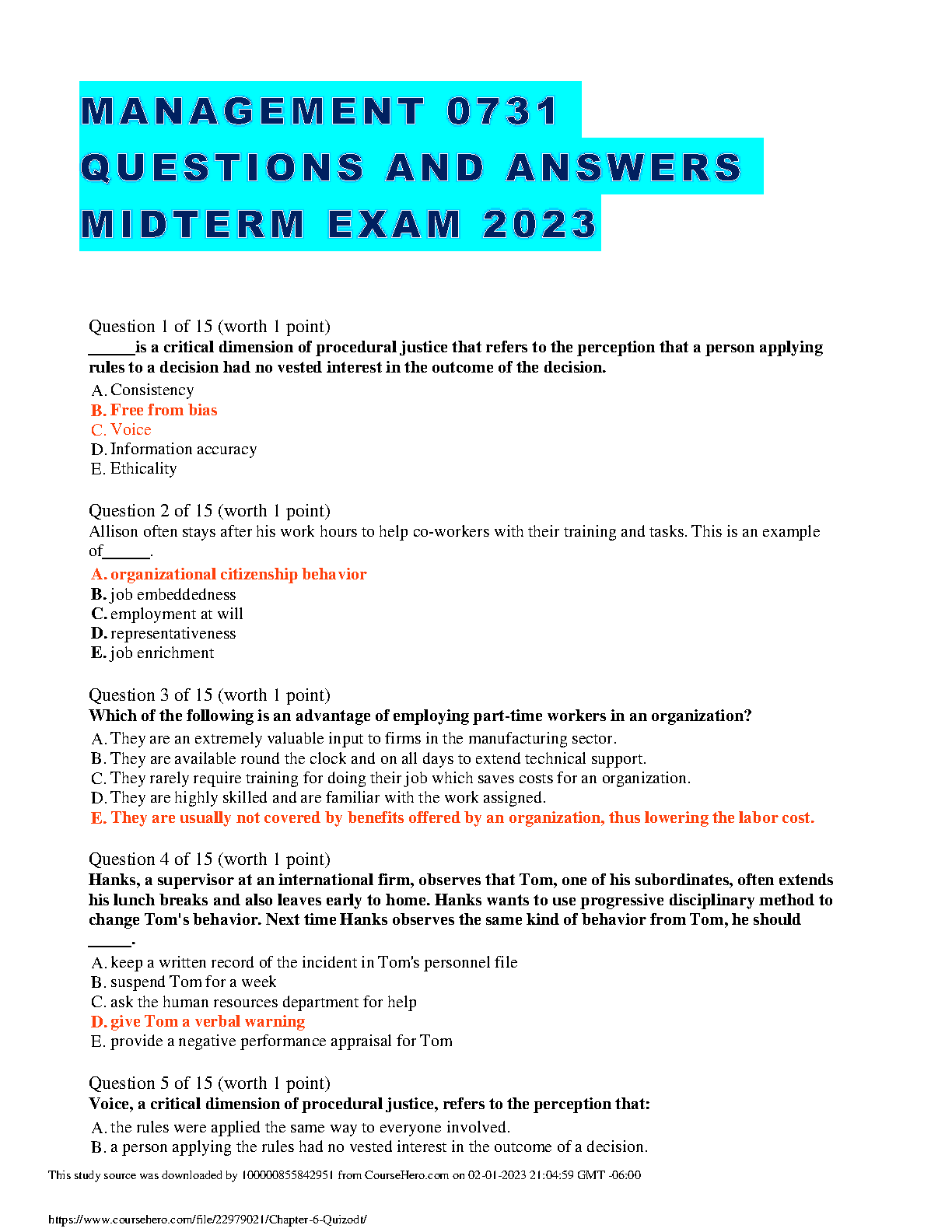 This resource contains practice questions and answers for the Management 0731 Midterm Exam 2023. It can help students prepare for the exam and improve their understanding of the course material. This resource was downloaded from [website name]