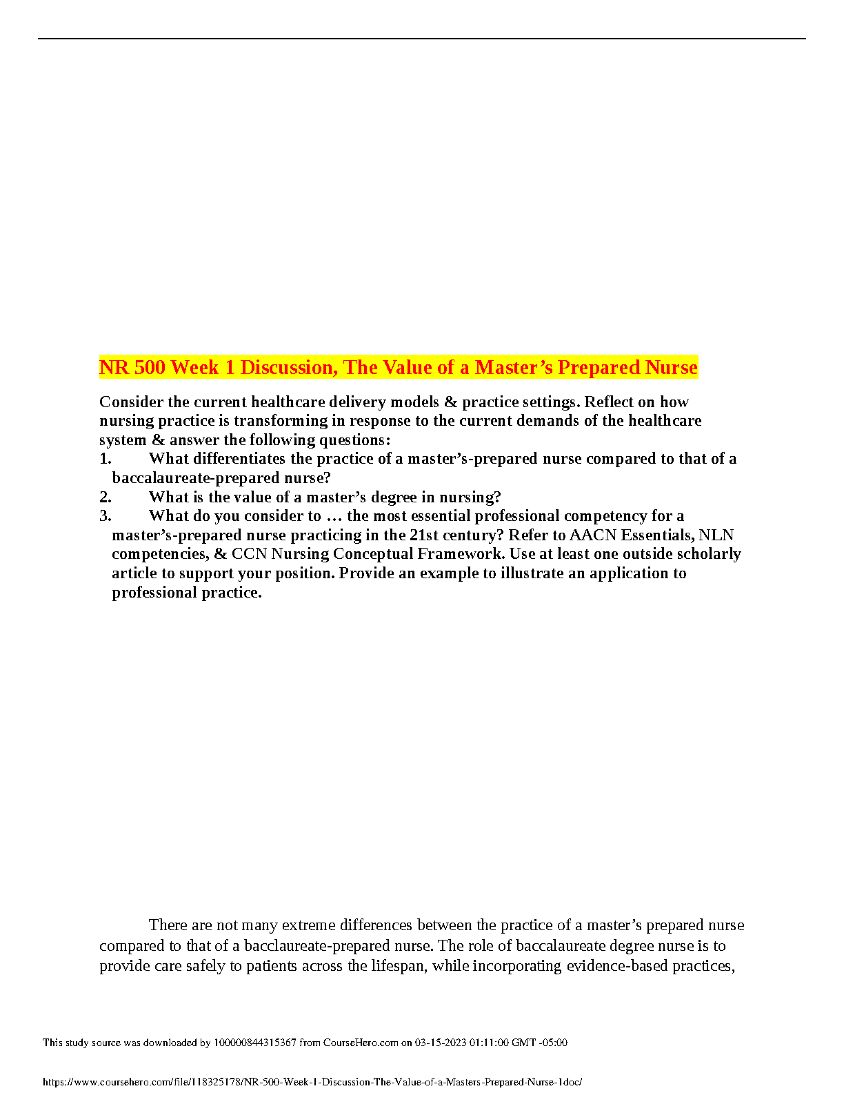 This resource will help you ace your NR 500 exam on the first attempt. It covers Week 1's discussion on the value of a master's prepared nurse, providing insights into the current healthcare delivery models and practice settings. Get ready to confidently answer questions on the differences between a master's and a baccalaureate-prepared nurse, the value of a master's degree in nursing, and the most essential professional competency for a master's prepared nurse.