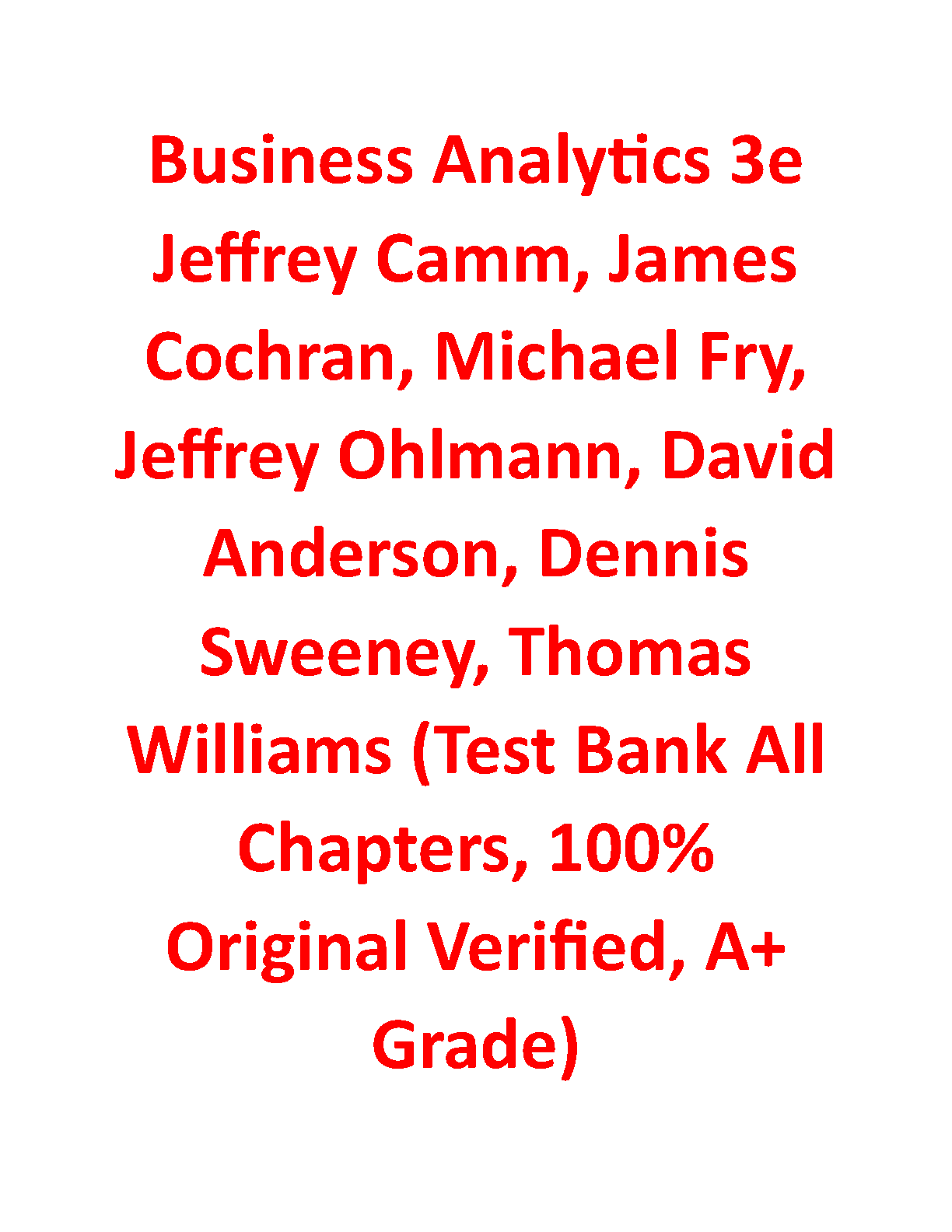 Download the comprehensive Business Analytics 3rd Edition test bank by Jeffrey Camm, James Cochran, Michael Fry, Jeffrey Ohlmann, David Anderson, Dennis Sweeney, and Thomas Williams. This solution manual contains answers to all end-of-chapter questions, ensuring you are fully prepared for your exams.