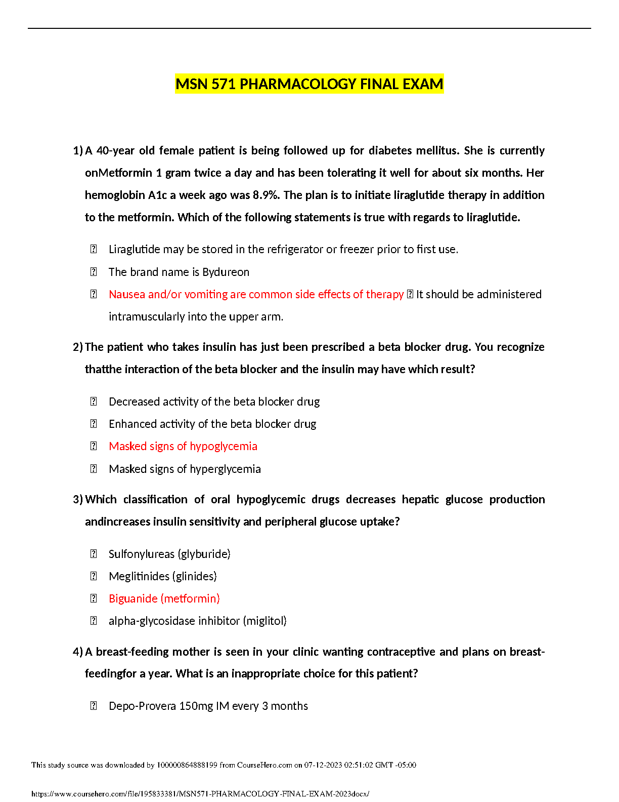 Ace your MSN 571 Pharmacology Final Exam with this comprehensive practice set. Featuring a curated selection of challenging questions and detailed answers, this resource is your key to mastering key concepts and achieving a passing score on your first attempt.